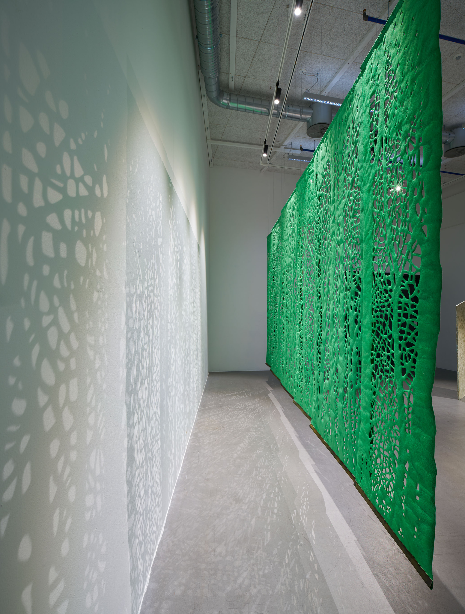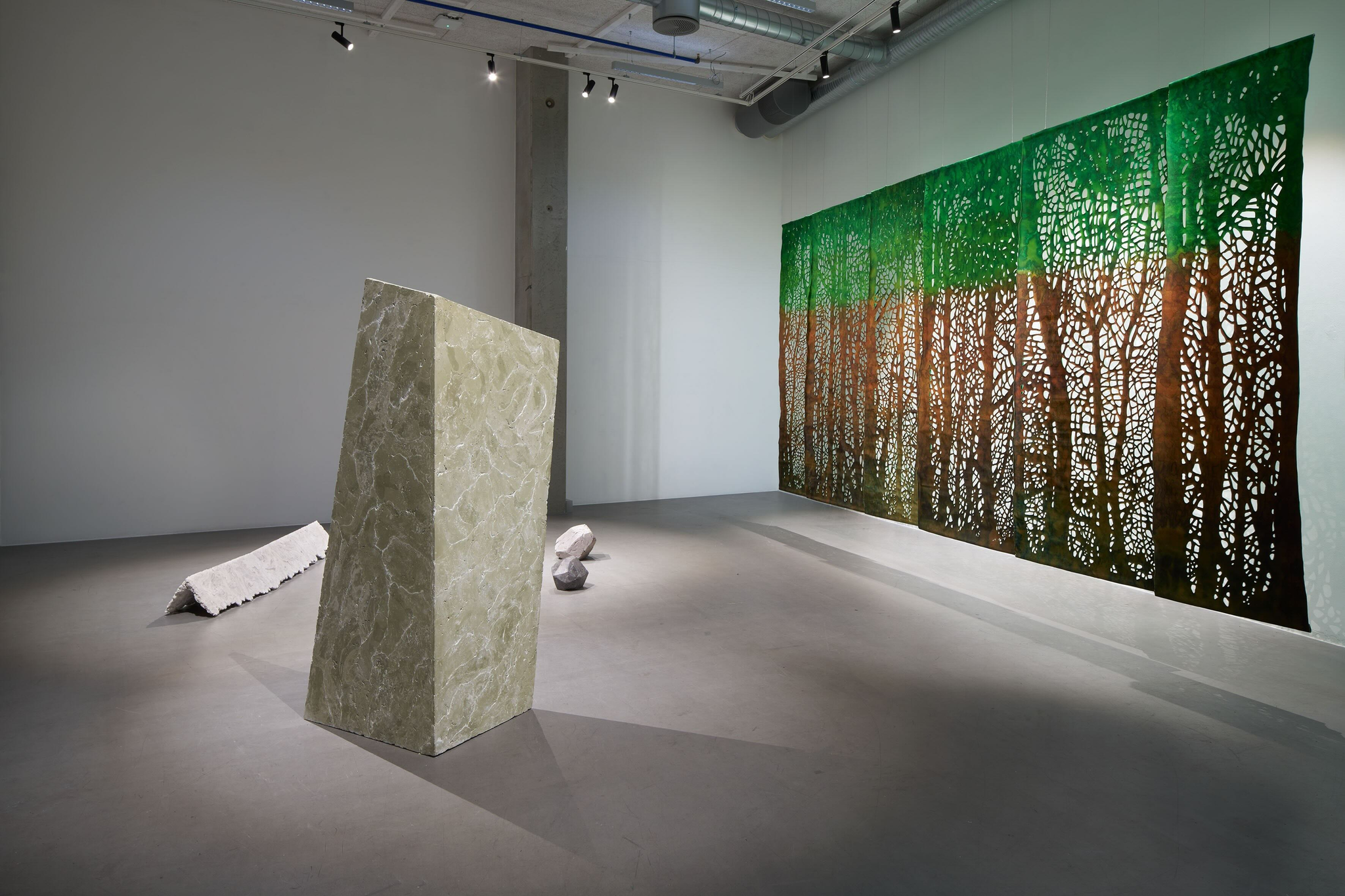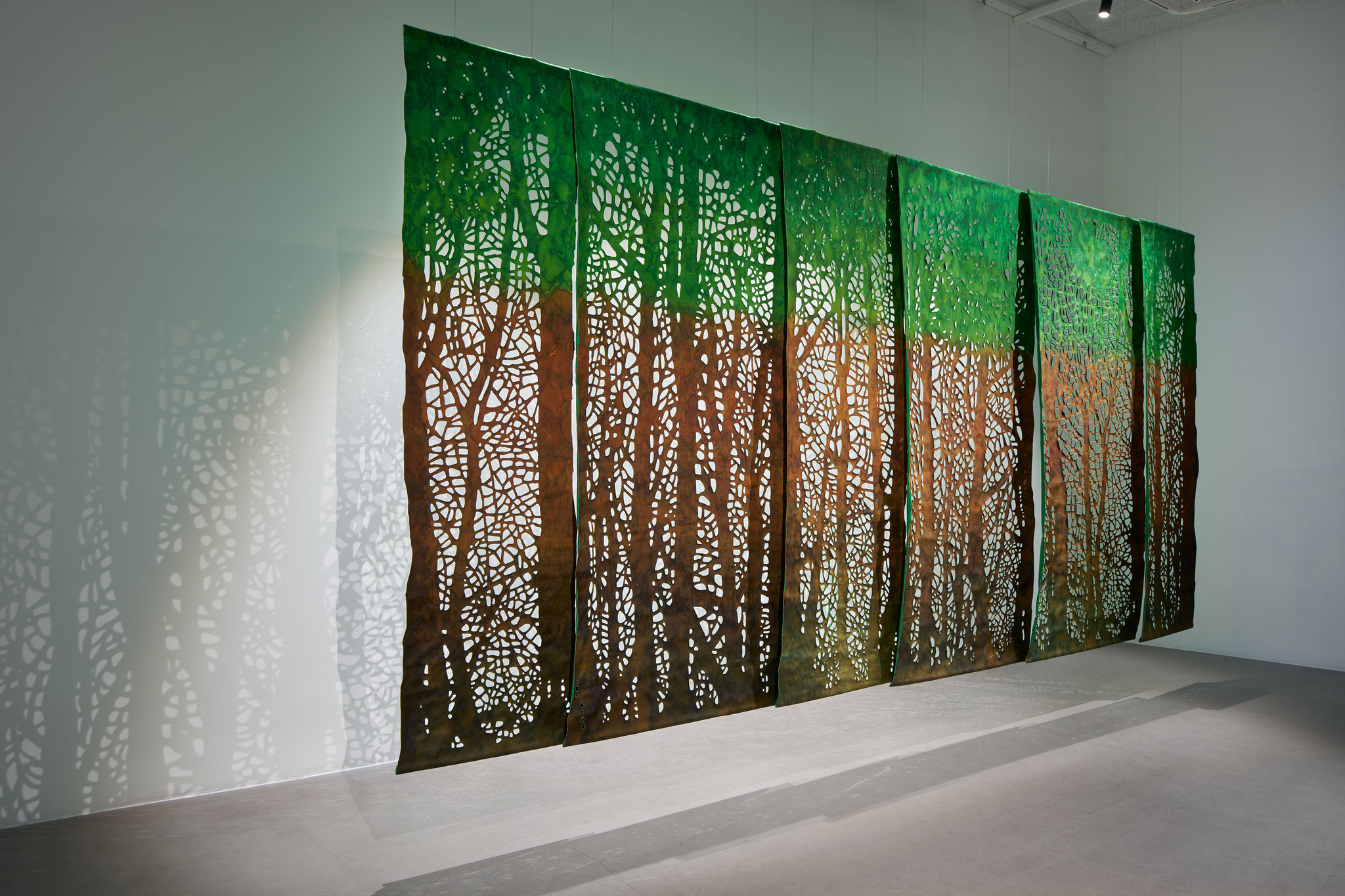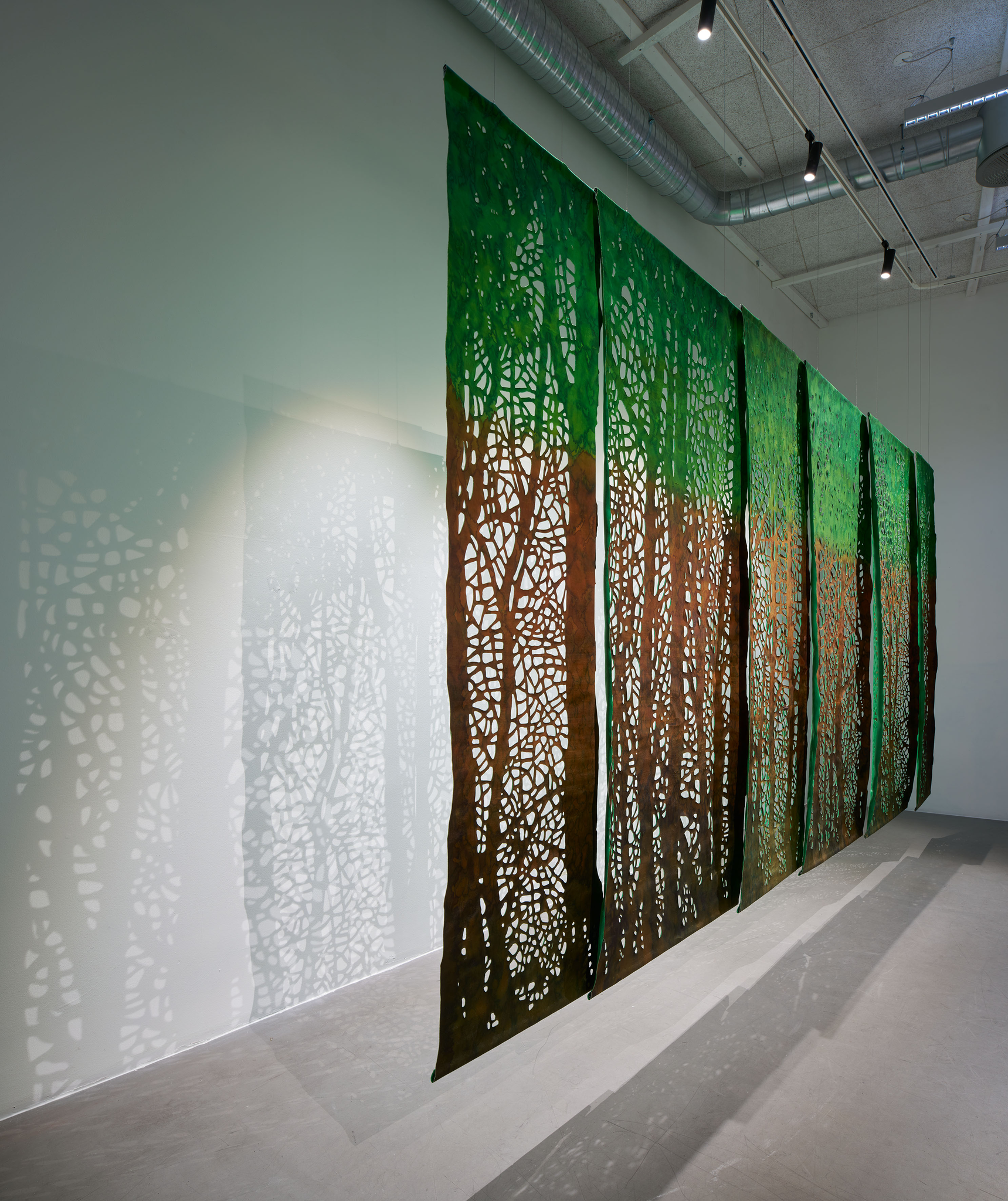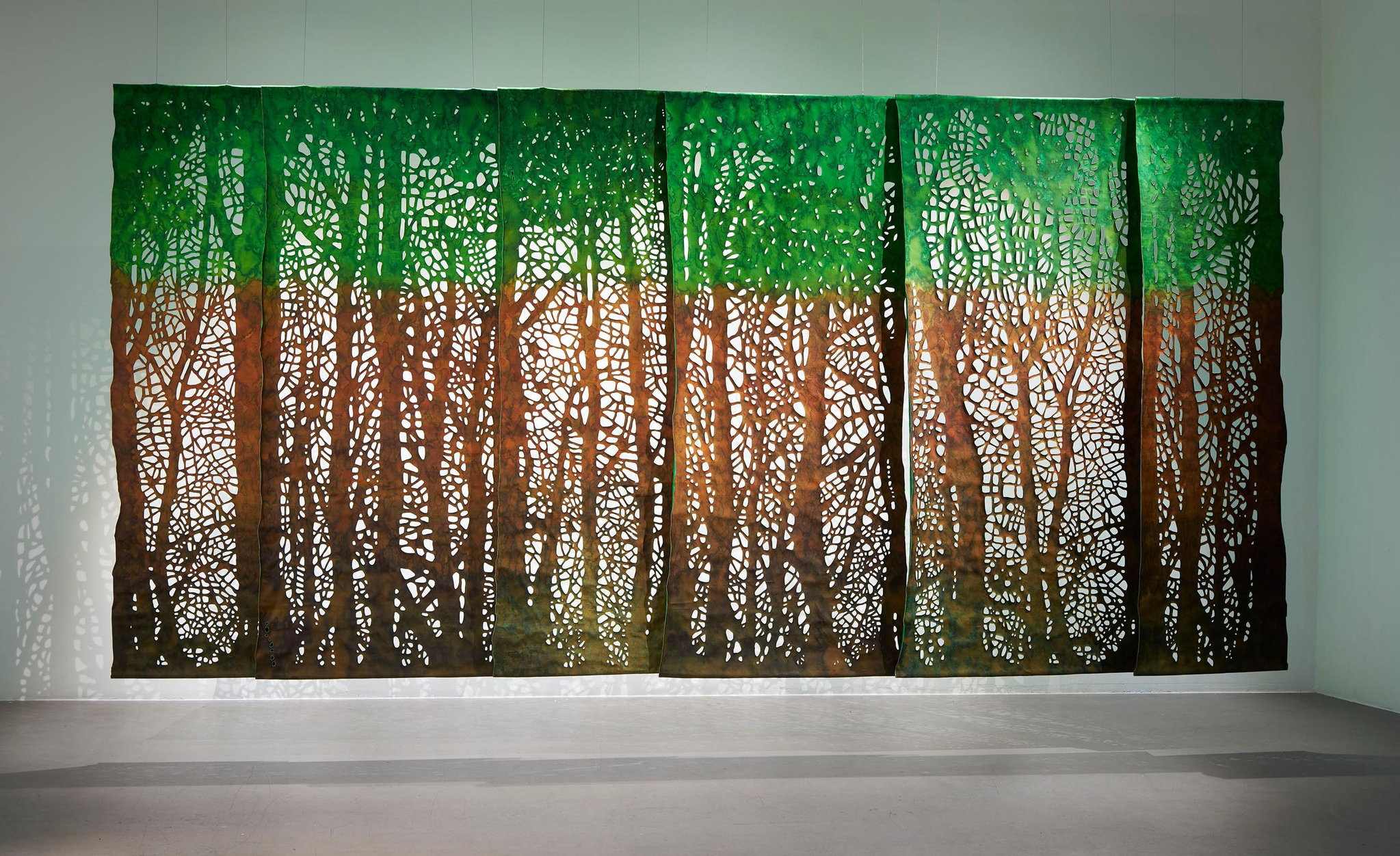 Tekstilarbeidet som Aarset viser i Arkadia er utviklet under arbeidstittelen en under søkelse av skogs holt. Det refererer til skogen slik den blir fremstilt i nordisk kultur: et kontemplativt og til-nærmet hellig sted, et slags mytisk arkadia. Den viktige rollen skogen har spilt for mennesket gjen-nom tidene, og de mange måtene dette kommer til uttrykk på, er i det hele tatt noe Aarset interesserer seg for. I arbeidene vi møter i Arkadia, har hun malt med reaktive farger på silke, bomull og lin. Disse tekstilene har hun laminert, for så å skjære ut motiv. Digital bearbeiding er også en del av Aarsets prosess, med andre ord kombinerer hun tradisjonelt håndverk med nyere teknologi. Til dette prosjek-tet har hun testet ut bruken av moduler og ulike sammen føyninger, for å kunne bygge materialet utover i enda større format enn tidligere.