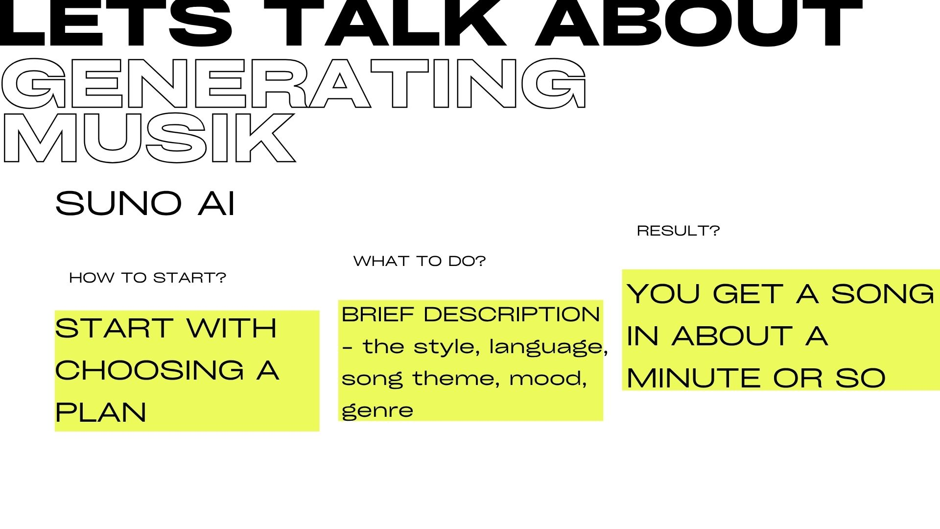 To create a song, a user should give a brief description of what exactly they want to get. That includes style, language, song theme, mood, genre... It is also possible to give AI an assignment to use existing artist’s style – “make me a song in Dua Lipa’s style”. First the text will be generated, and in a couple of minutes it will be possible to hear the final product [6].