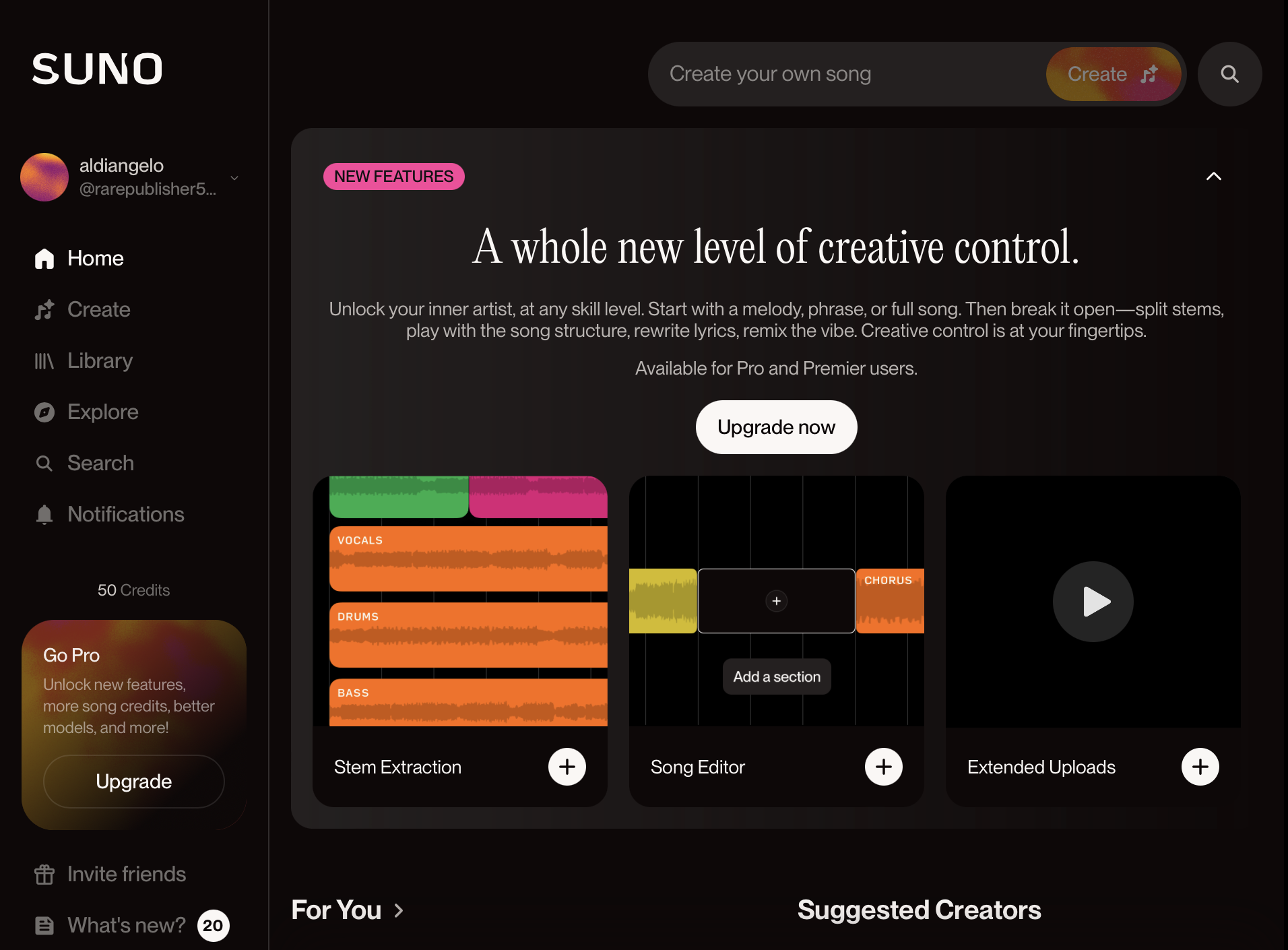 Suno AI, or simply Suno – a generative AI music creation program - can generate realistic songs that combine generated song text, vocals and instrumentation. The company claims that with their program user can “create stunning original music in seconds…, make your own masterpieces…” Free plan enables a user to generate 10 songs per day, to use only standard features such as text generation and etc. and to upload up to 1 minute of audio. With this plan music cannot be used for commercial and has no add-on credit option. However, within Pro Plan only for 8 US dollars per month a user has more freedom and ability to use generated music for commercial purposes. There is Premier Plan that costs 24 US dollars per month, but there is no real difference in features between this plan and Pro Plan (only the amount of daily generated songs).