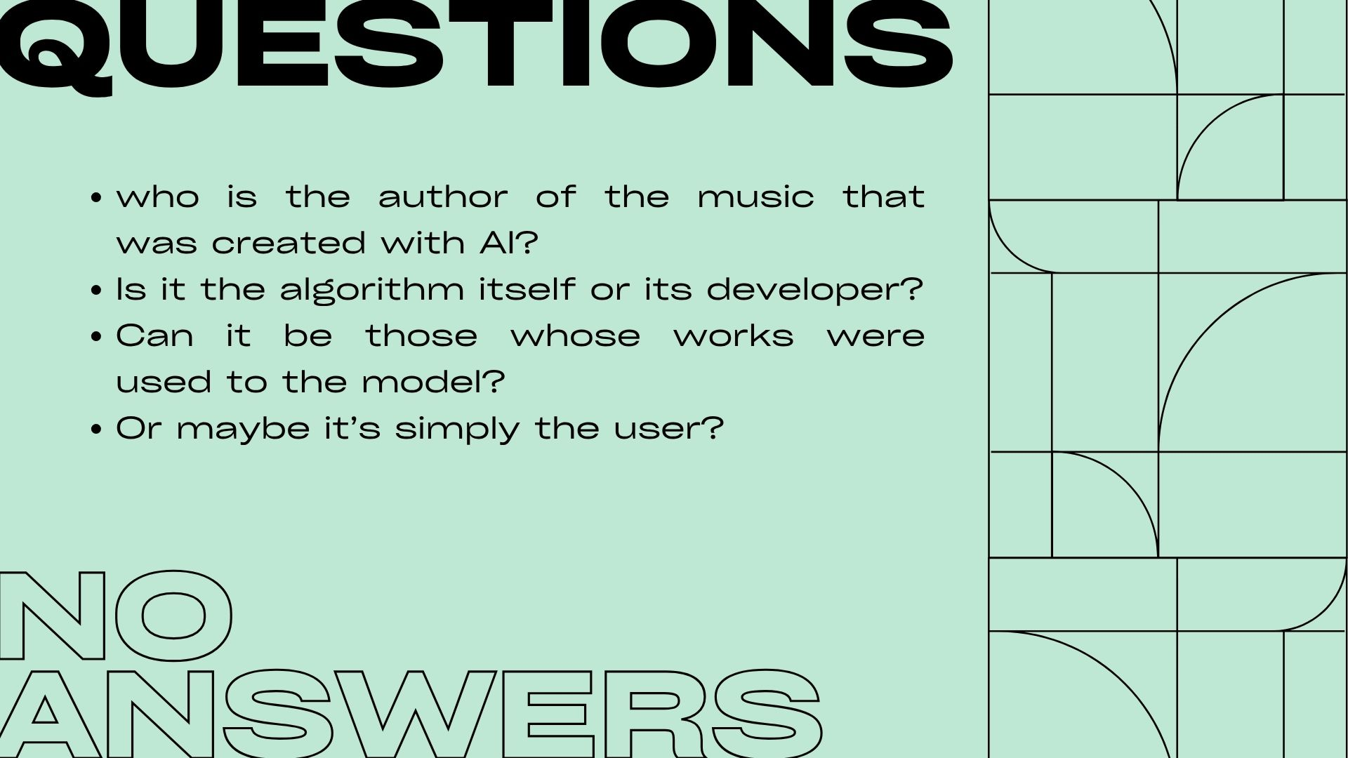 Apart from a huge number of ethical questions regarding the usage of AI in music, there are numerous artistic challenges. The question of whether an algorithm can produce a truly original and emotionally resonant work of art, or whether it will merely be a successful amalgamation of existing styles and techniques, remains unanswered.