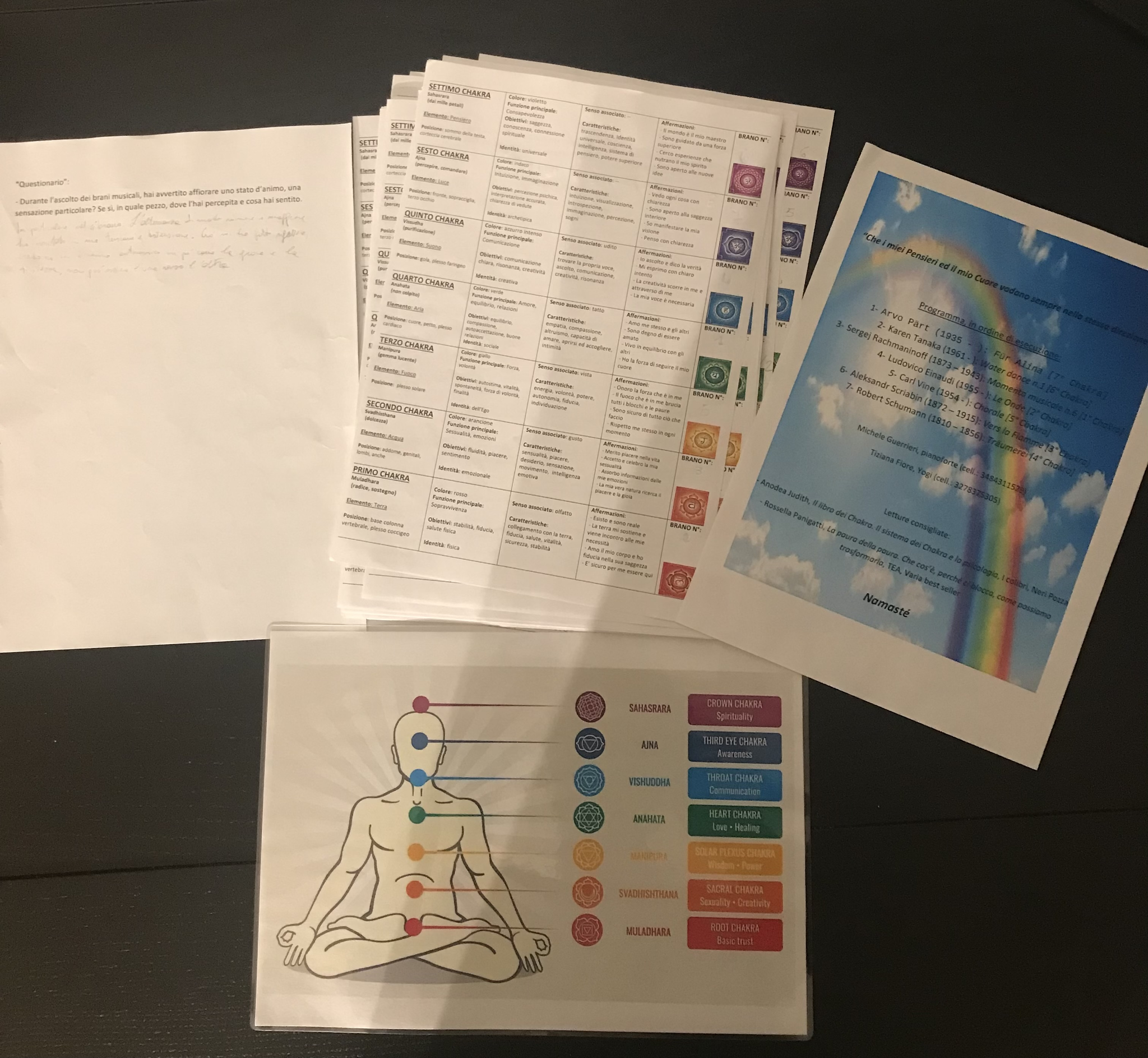 Then, I’ve performed the piano pieces (you can find in the order in the flyer with the rainbow in the background), giving the audience time, between the pieces, to choose and pencil the piece number from one to seven in the right column of the questionnaire, above the corresponding Chakra symbol.