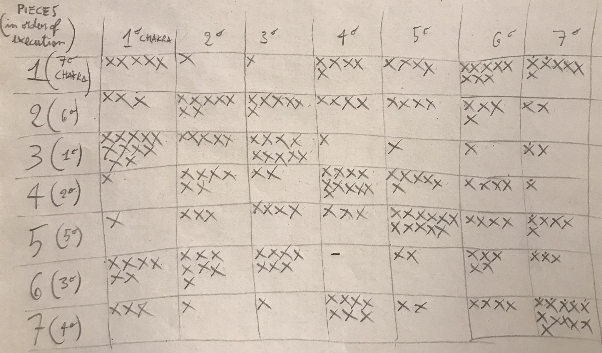 As the table with the x's, i.e., the choices of the 30 participants, illustrates, regarding the 1st chakra, the majority chose Rachmaninov's piece, spiritually agreeing with my association.
