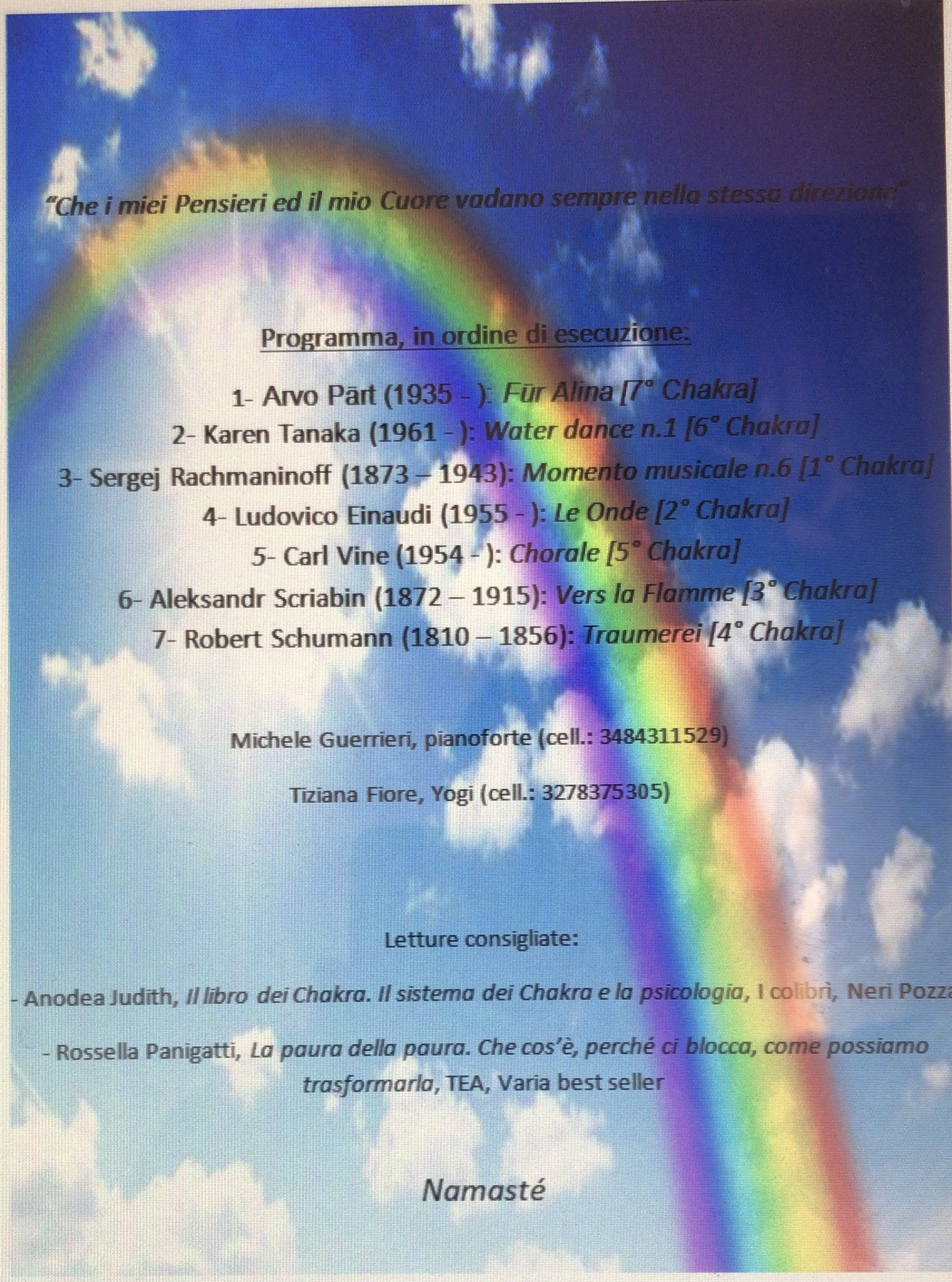 In conclusion, I distributed the flyers (with the rainbow in the background) with titles, order of the pieces, and the association to a particular chakra (plus other information such as recommended readings and a couple of evocative phrases). I therefore explained the reasons for my choices, why I chose that particular piece with that particular chakra.