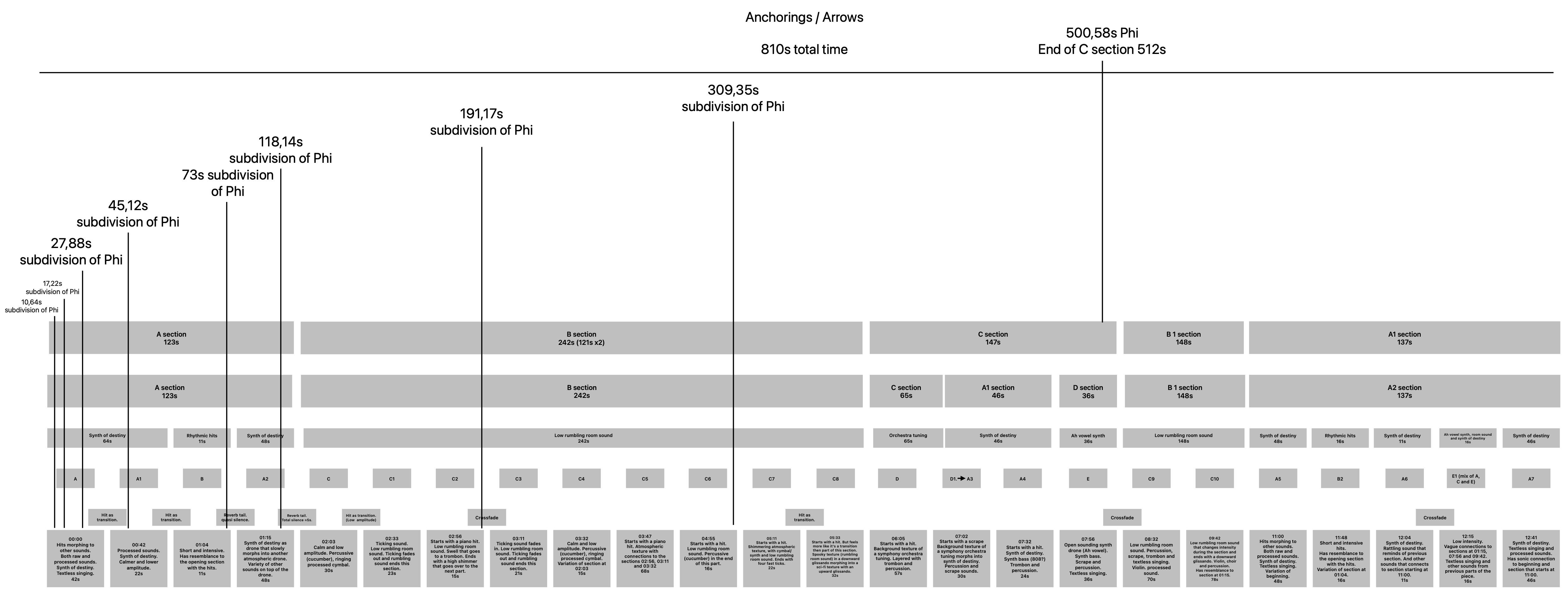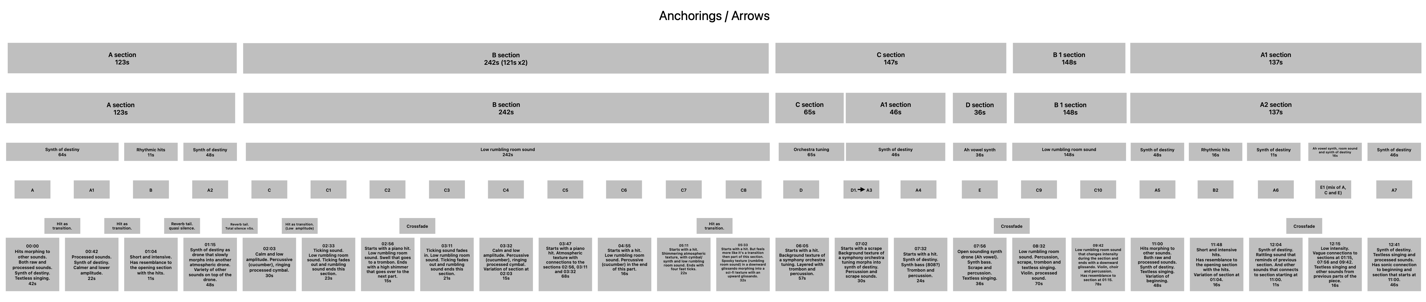 Anchorings / Arrows is a collaborative piece by Jens Hedman and Erik Mikael Karlsson composed in 1992. In my analysis of the form in the composition, came I to a conclusion that the macroform is A, B, C, B1, A1 where the first B section could be seen as two B sections put together. The duration of the piece is 13:30 minutes long and by dividing the first B section into two sections will give all the sections fairly similar length in time.