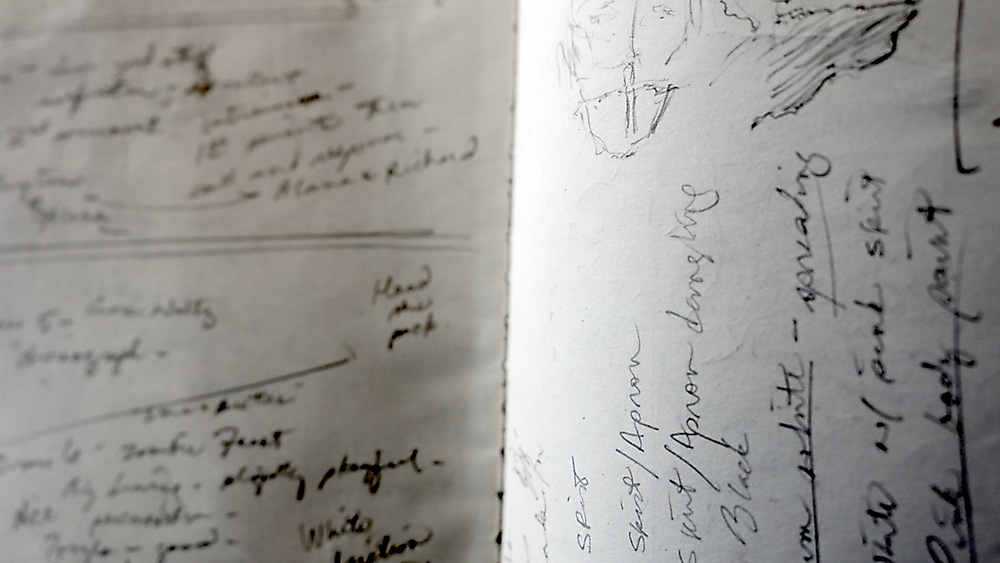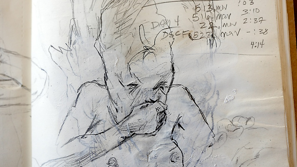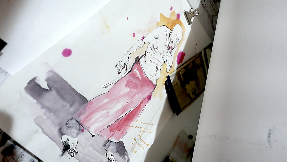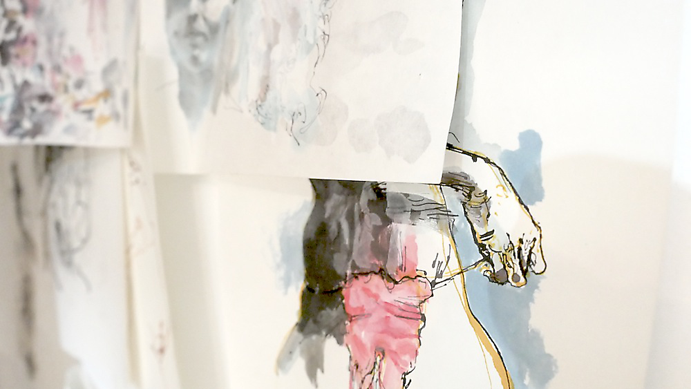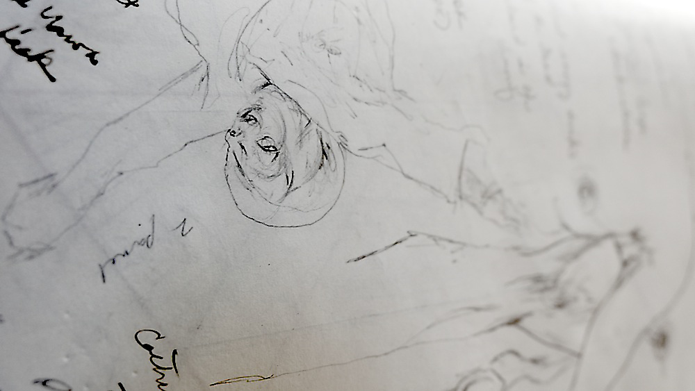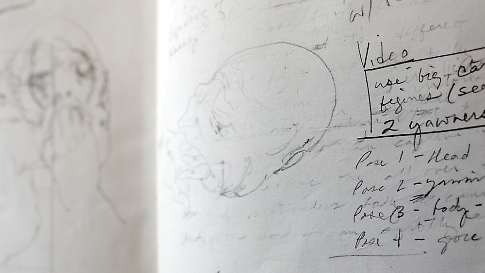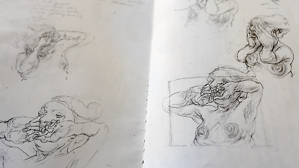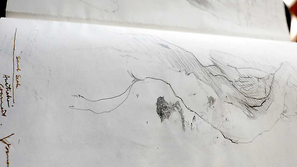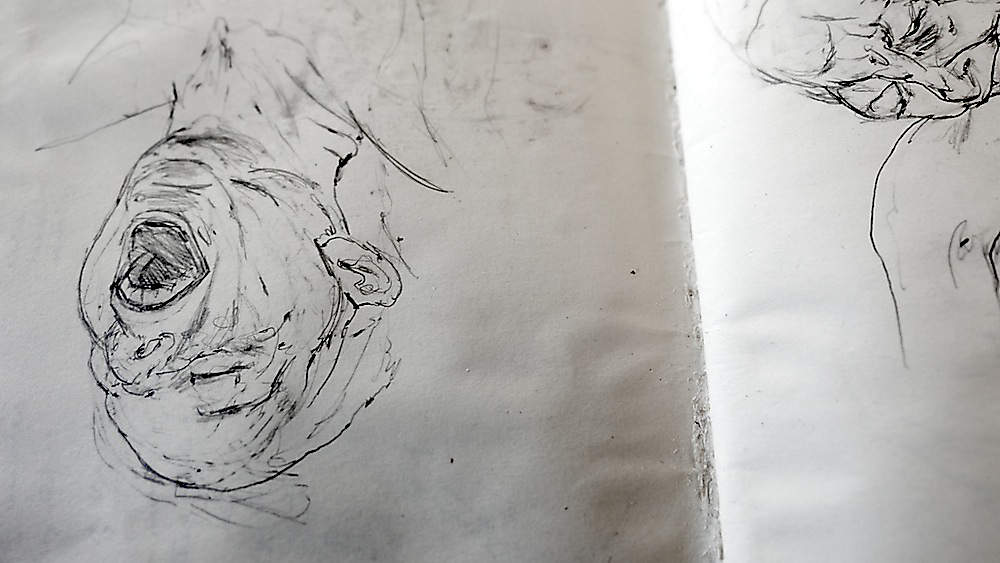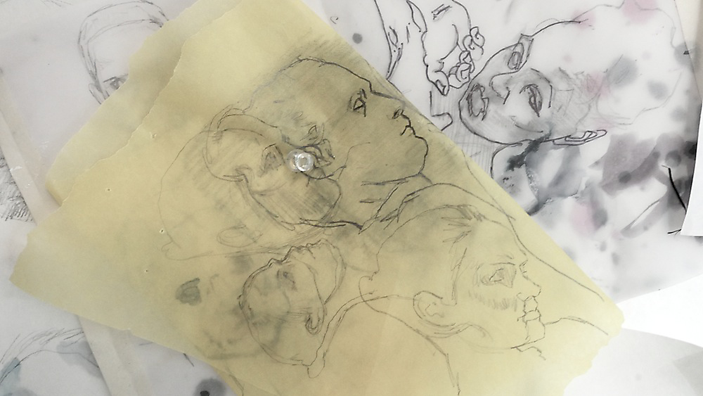 Over 200 sketches were produced in the planning stages of Tullah and Tom: A Drawing Affair. Sketching, in this exposition, has a problematic relationship with rehearsal. Sketches should not be reduced to metaphorical rehearsals for other forms of art (and calcified as preparatory works with singular vectors pointing towards specific outputs). This distinction, however, is complicated by the many qualities and characteristics shared between sketching and rehearsal. Both are clearly conceived of as iterative and speculative practices that precede and often supersede other drawing and performance processes. Both are also framed as informal and intuitive processes. Both sketching and rehearsal are conventionalised as closed forms, available only to the artists and performers (the private sphere of rehearsal and sketching is seductive for the insight it lends to artists’ meaning-formation). So why not just chalk them up as analogous and move on? Perhaps the greatest flaw in the quick and convenient marriage of sketch and rehearsal is the degree to which the comparison embeds misunderstandings of both. A sketch is not a planning document and a rehearsal is not training. The nexus of the analogy fails when each component hinges on a reductive operation.