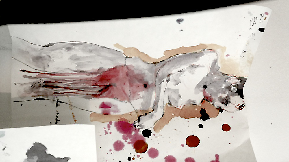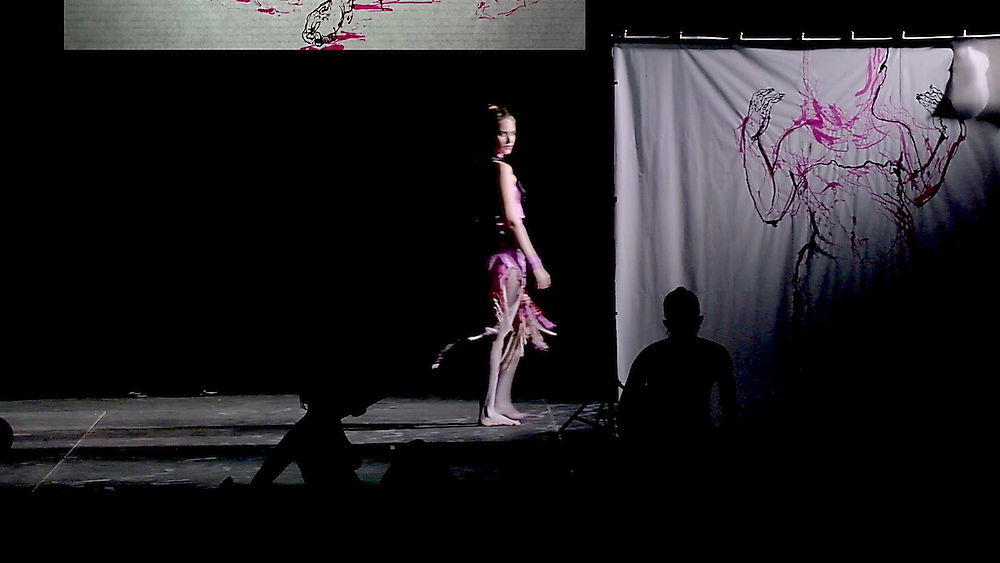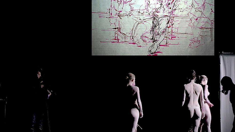 Rehearsal video projected on stage as part of the performance drawing.