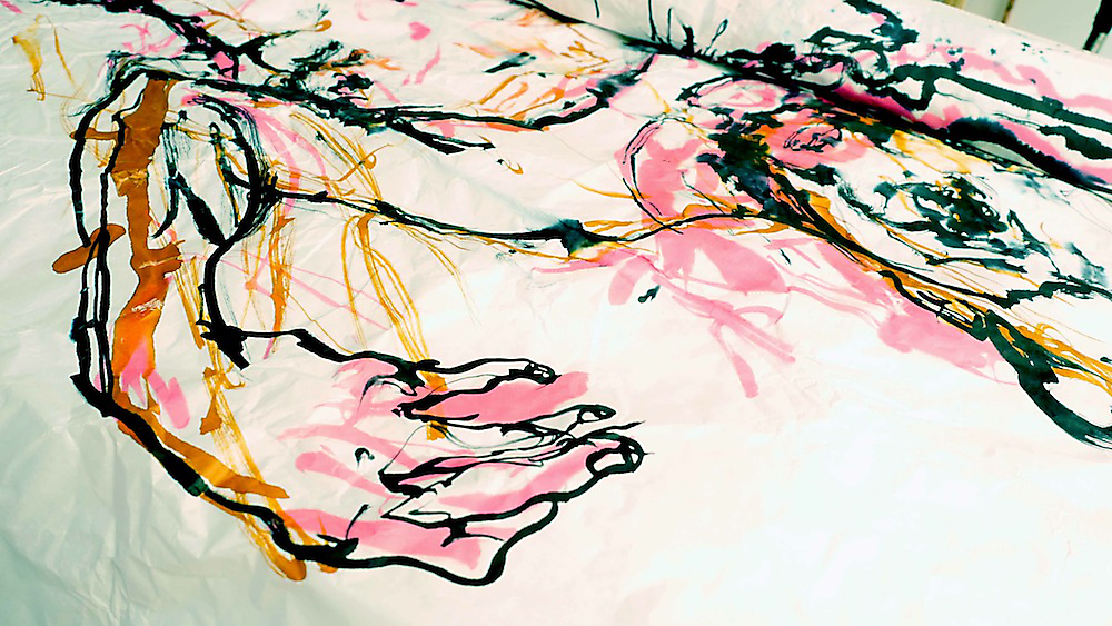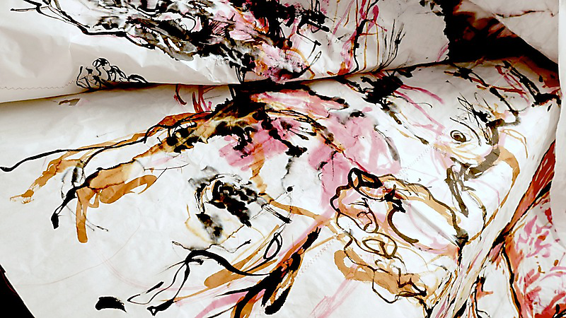 Tullah and Tom: rehearsal video of drawing process — ink on rice paper, 2.5m x 1.5m.