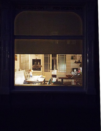 Although by night the city mostly goes to sleep and only a few gleams of outdoor activity stay awake, which is normally expected during that time of the day, the display of indoor life is what sparks inside the darkness. The 'inside' turns to 'outside', and the activity -or non activity- that goes on in the houses is showcased for the passer-by with even more clarity.