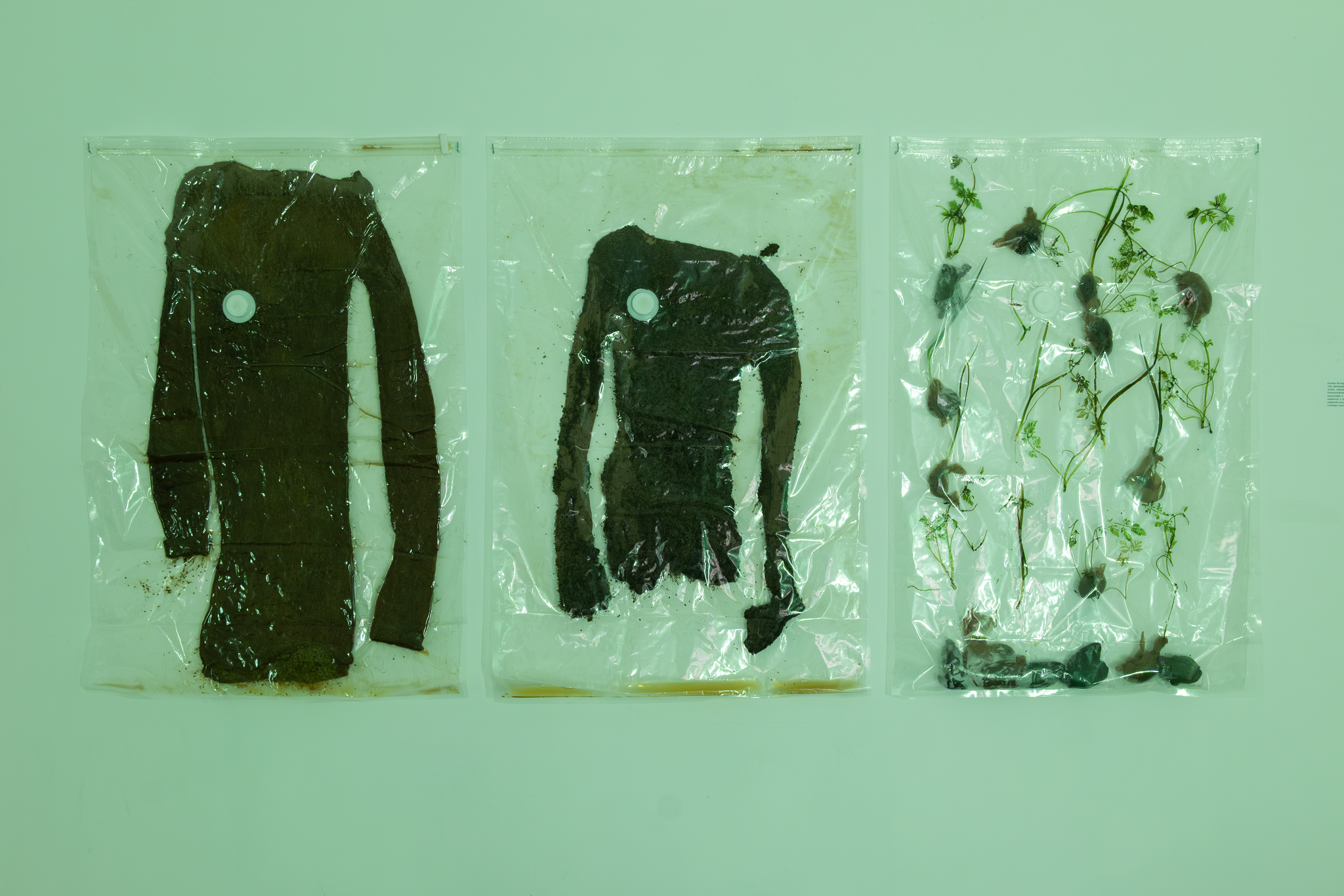 Estudos de fragmentos de roupas em lycra cobertas com rebentos de chia germinados. Os elementos vivos crescem e morrem sobre o tecido, criando uma pele híbrida entre o orgânico e o artificial. Posteriormente, são selados em plásticos de vácuo, num gesto de preservação e contenção do efémero. Através desta manipulação, explora-se a tensão entre vida e permanência, corpo e memória, propondo uma reflexão sobre os limites do orgânico e as tentativas de controlar o tempo e a transformação da matéria.