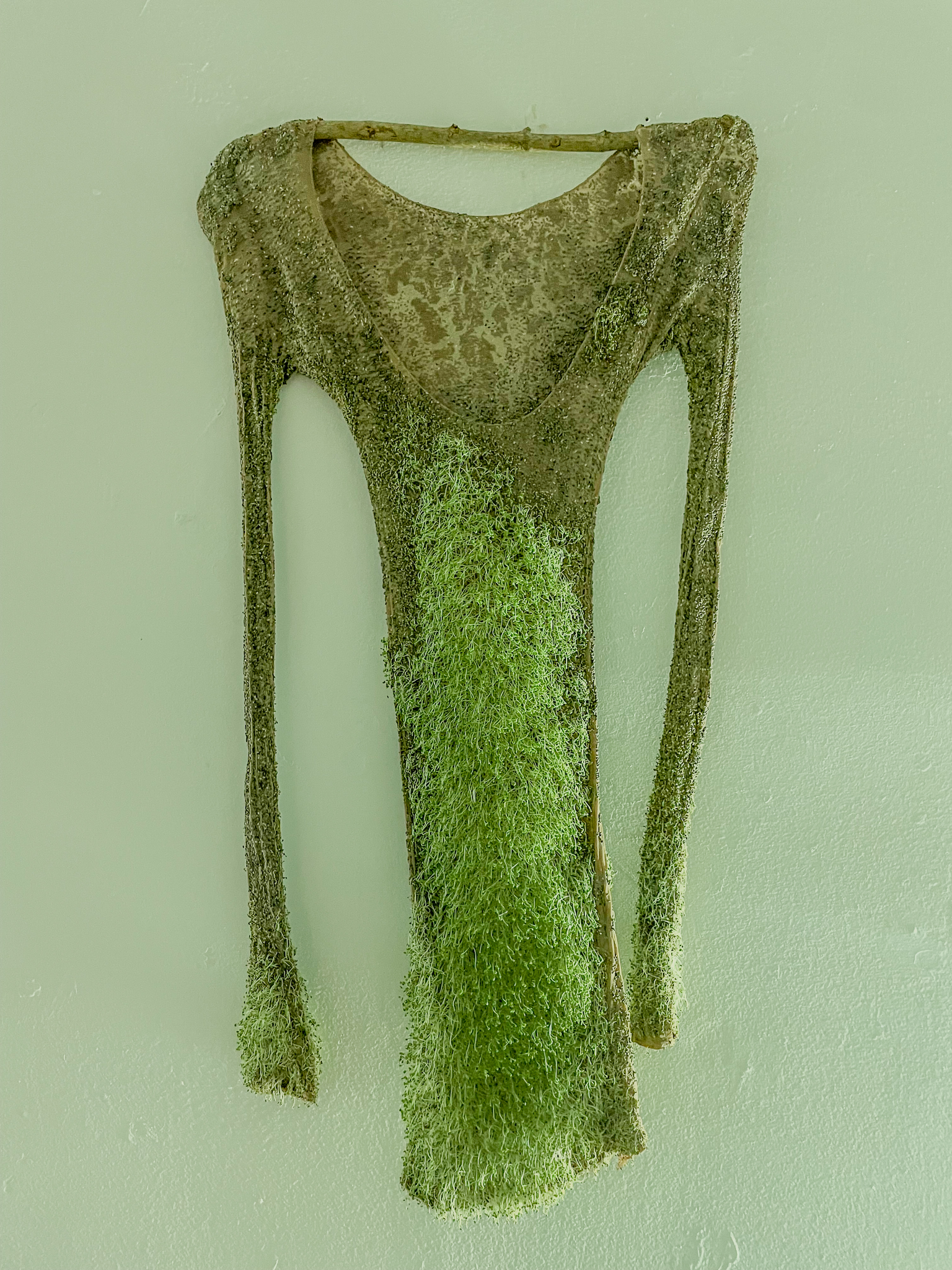 Camisola de lycra, coberta por rebentos de chia germinados, dá continuidade à pesquisa iniciada na performance “Vestir o Efémero”. O tecido torna-se suporte de matéria viva, criando uma segunda pele em constante transformação. A presença dos germinados evoca ciclos de crescimento e decadência, ativando o corpo como território transitório. A peça carrega em si a impermanência do gesto performativo, preservando vestígios de um tempo que insiste em desaparecer, convidando à reflexão sobre o efémero como forma de presença.