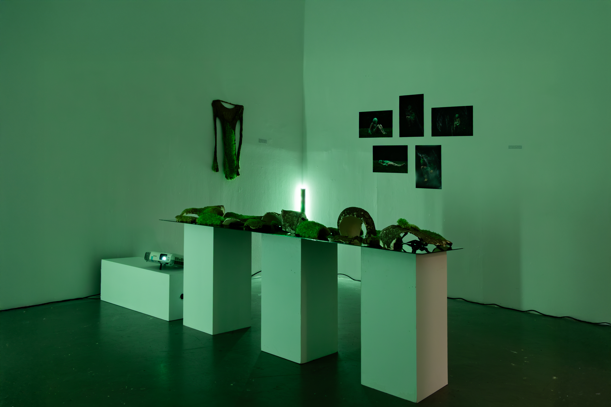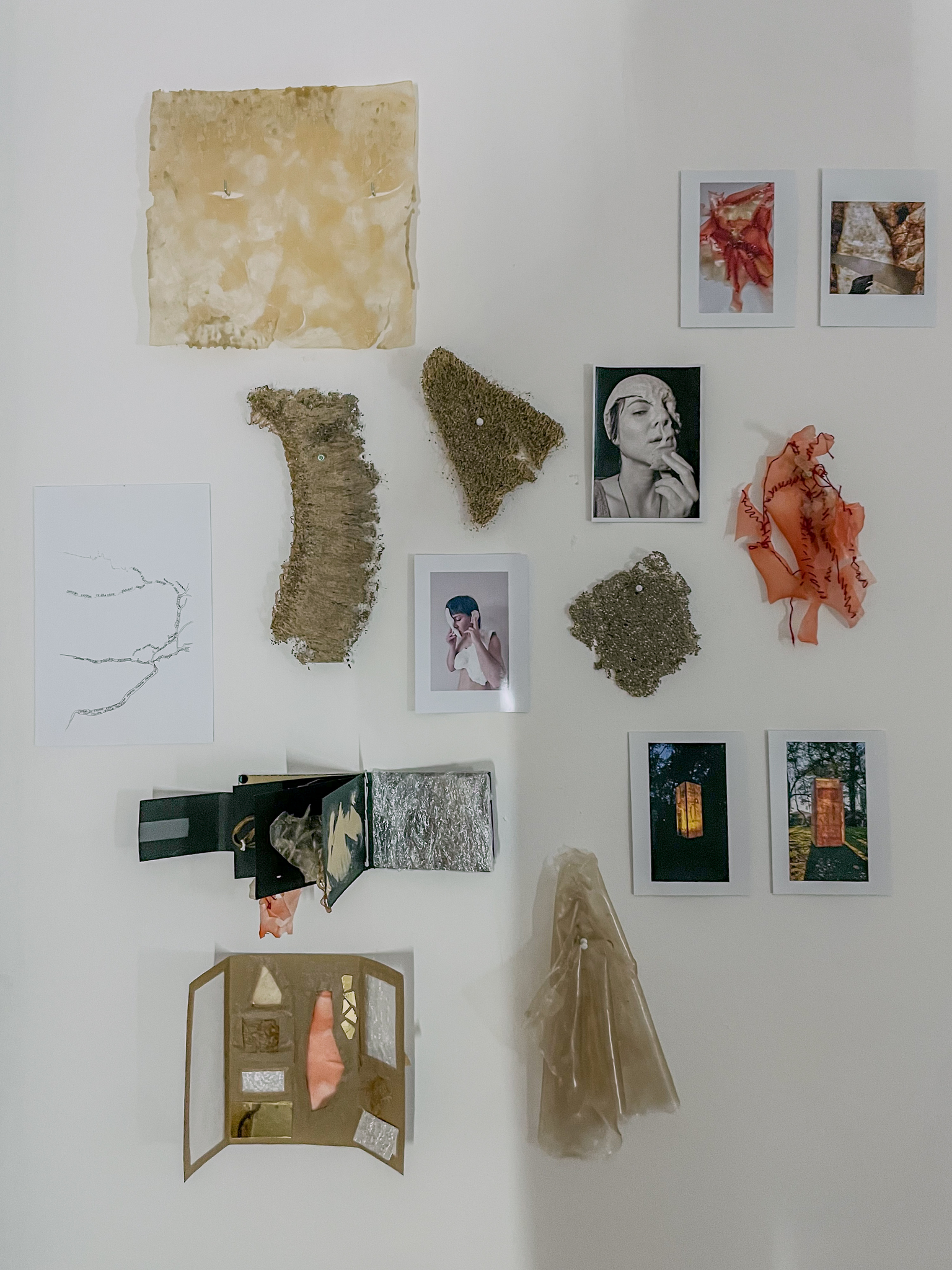 Conjunto de estudos visuais que documentam o processo experimental. Os registos incluem negativos de texturas naturais, testes com plásticos biodegradáveis, explorações de negativos e positivos ou fotografias que integram elementos ao corpo. Cada elemento revela uma metodologia de experimentação, onde os estudos funcionam como um espaço de pensamento visual em construção, revelando caminhos, tentativas, erros e acasos que compõem a base do trabalho desenvolvido.