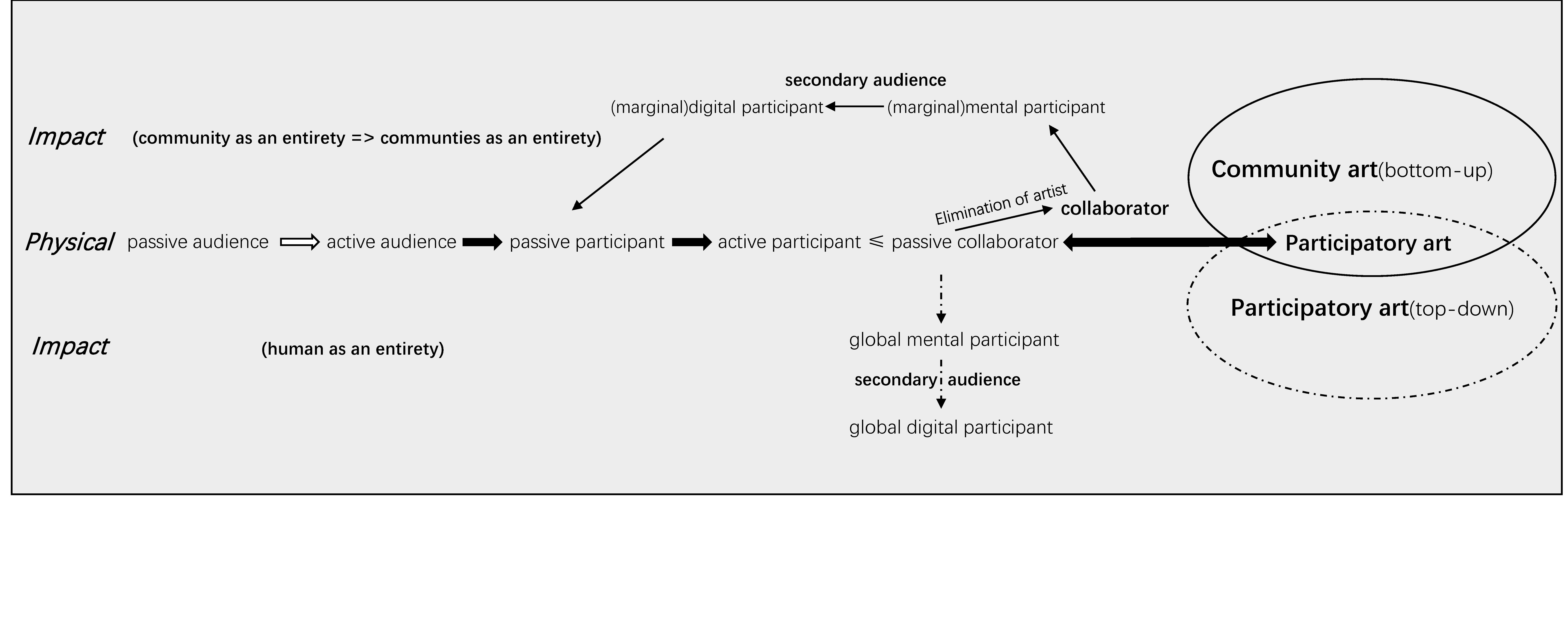 Only under these circumstances can it avoid John Robert’s criticism of the ineffective ‘micro-utopias’: “imposing a coercive consensus on the complex and multivalent personalities of individual participants” (Roberts, 2015:55). In addition to Matarasso’s 1997 report, numerous qualitative studies have shown that there are close ties between community members or communities, and community art serves as an important means of social cohesion. People participate more as a collective, with a sense of collective identity, belonging, responsibility, and a sense of mission are strongest among collaborators— ‘the community as an entirety’. At this stage, everyone is equal. It will eventually spread to other communities that share common characteristics. Secondary audiences will move from aspiring to participate—or already being mentally engaged —to digital participation (which includes activities also like commenting, giving likes and sharing), and then to passive participation (whether by joining this community or others). In doing so, it forms a continuously active closed loop: all ‘communities as an entirety’.
