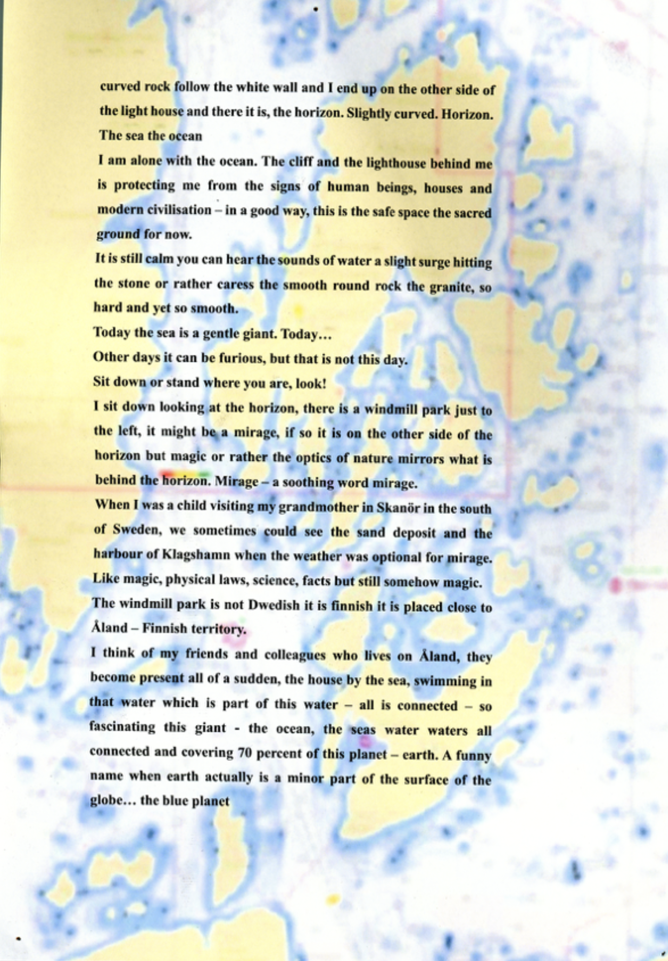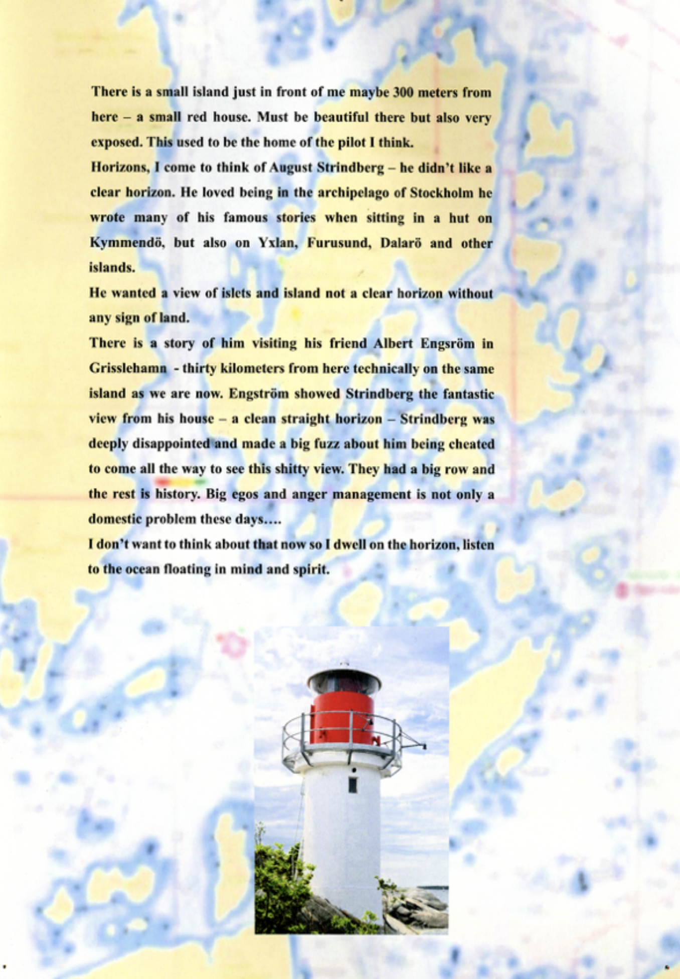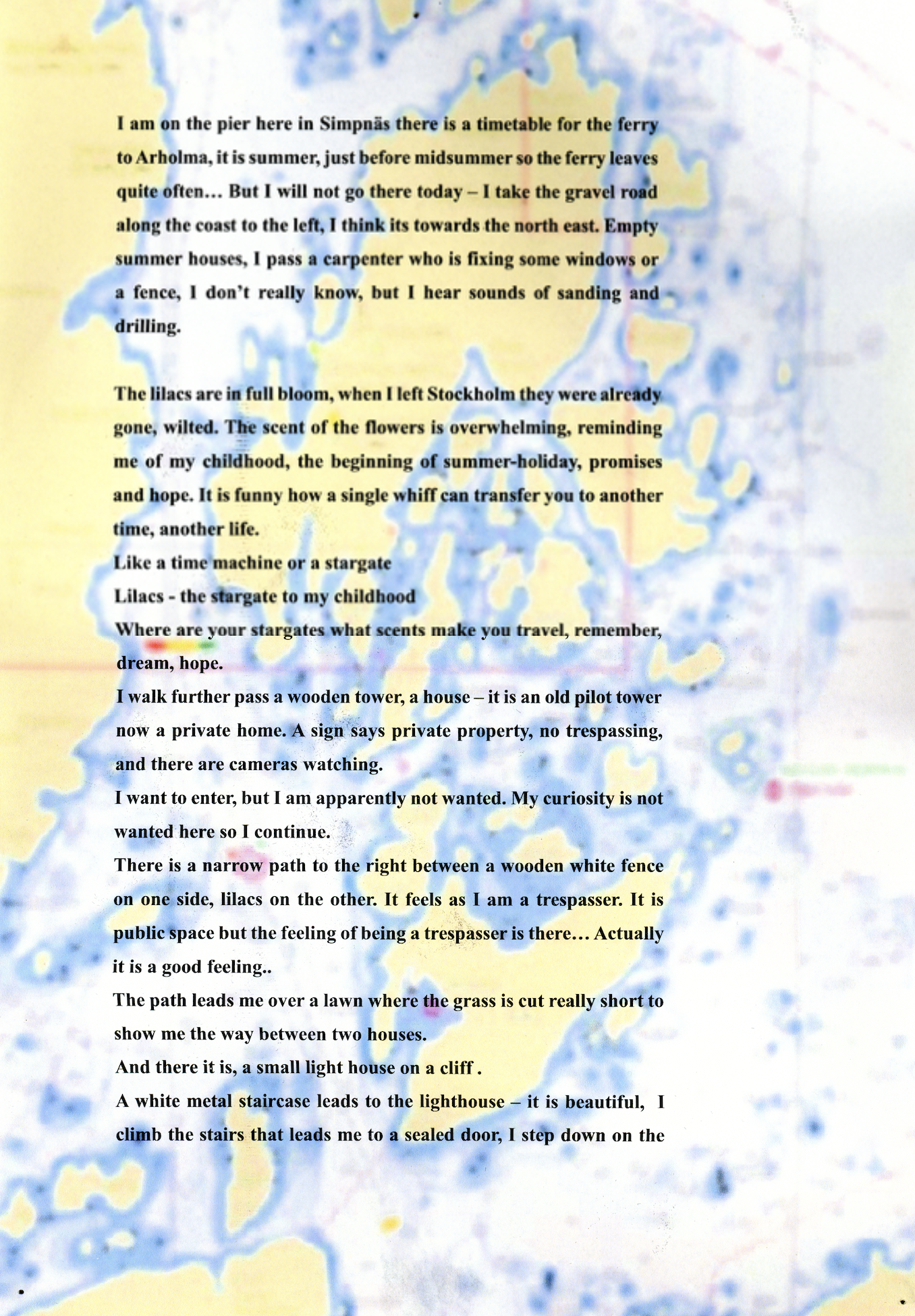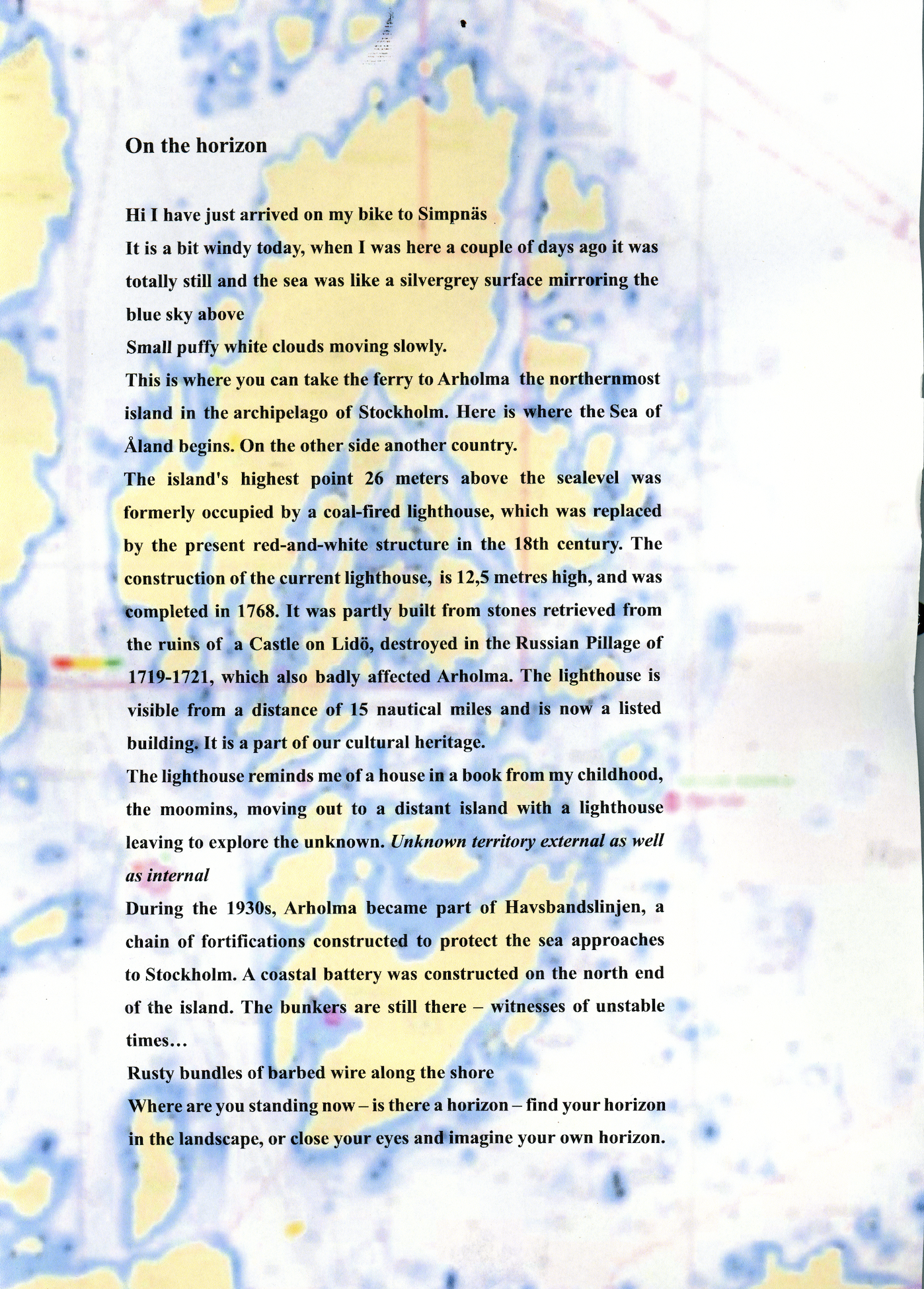 The below text was performed at BKN open studio and was made as part of BKN art trail with a QR. ode placement to the reading in Simpnäs over looking the lighthouse. In addition Annikki Wahlöö also did a Kitchen to Kamchatka walk for a fika performance. The artist is stressing that you can take any walk listen to the story unfolding. See how not only her landscapes comes together but also yours.
