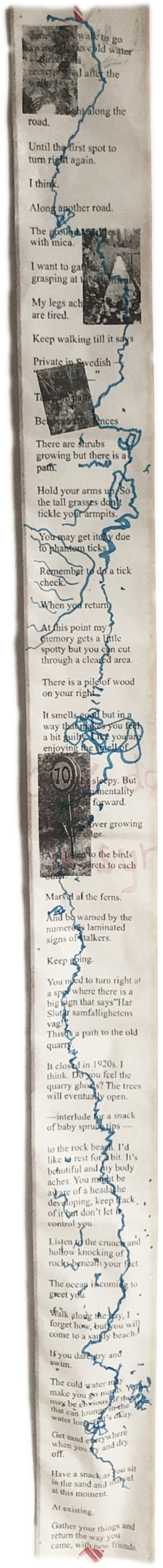 This tiny notebook contained images of pinecones, snails, slugs, and flowers, cynotypes of ferns, and repeating patterns of seaweed, all items catured on walks around Bjorko. It also contained prompts and questions around care, walking, memories, and fear. All themes that swirl as I walk.