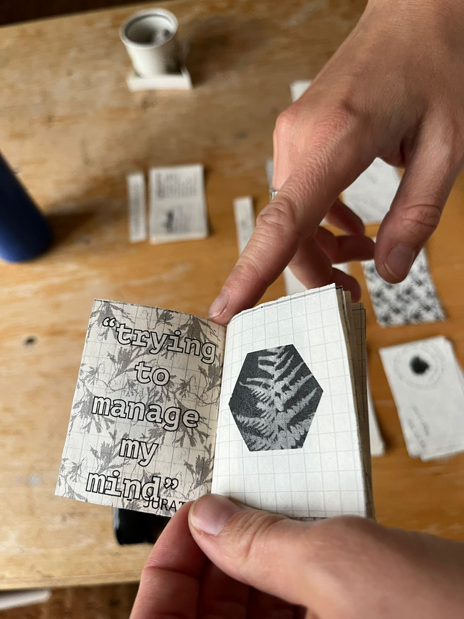 My practice often uses the creation of zines, or other pocket size treatures as tools for containing and summarizing explorations that feel expanisive, never ending, and unanswered.