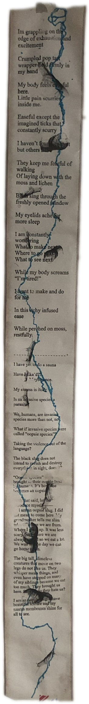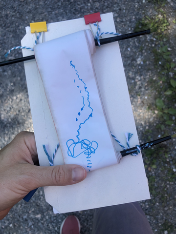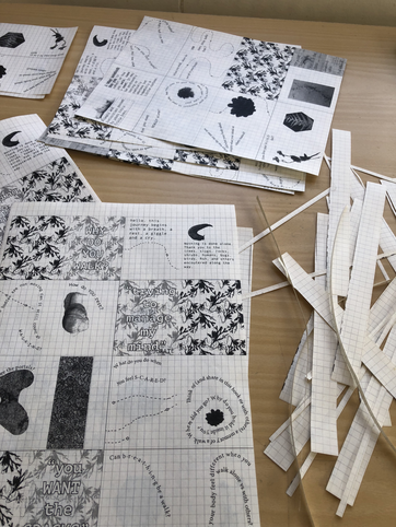 Obsessed with layers --nothing is ever what it seems --and inspired by Janice's walking-while-drawing machine, I began exploring drawing on paper before printing poetic reflections using the thermal printer I brought. I then also started printing images from the forest atop the text. Making the text hard to read, reflecting on how we only ever get part of the whole story. And leaning into elements of chance and randomness.