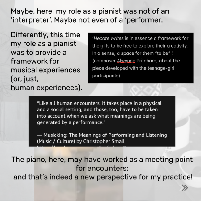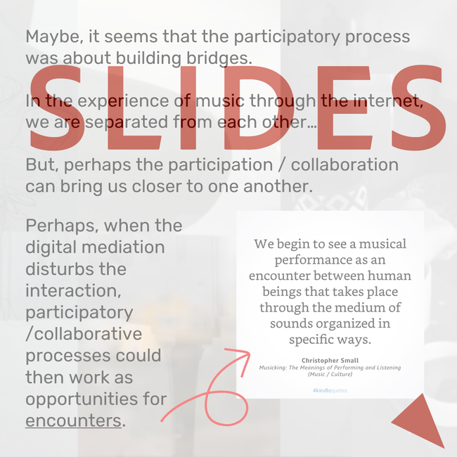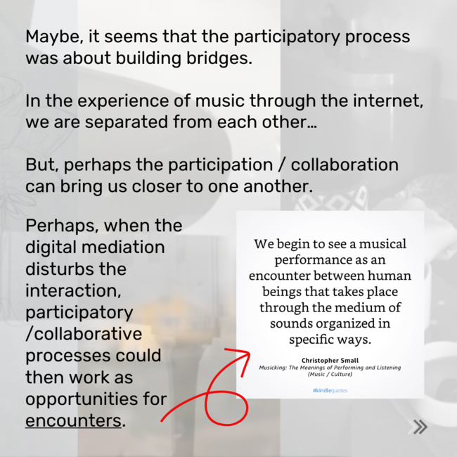 The music as an invitation project was situated in a practice-based research context, therefore the analysing and report writing were mandatory steps in its development. Having the requirement to write an article about the the learnings from each year of research was then a helpful element, working as a goal for the reflective process.