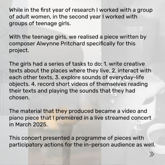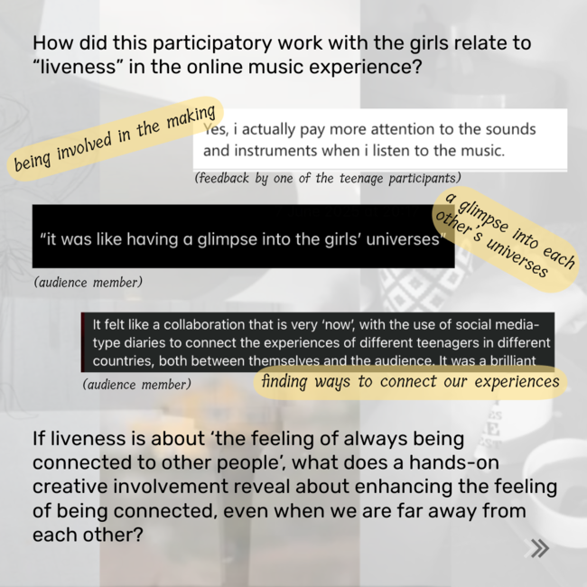 The reflective process of the second year of the project included looking back at those blog and diary entries, as well as at the participants’ feedback, which they shared though conversations and an online feedback form. Additionally, listening to the feedback collected right after the concert offered some insights about the participatory experience of the in-situ audience/participants.