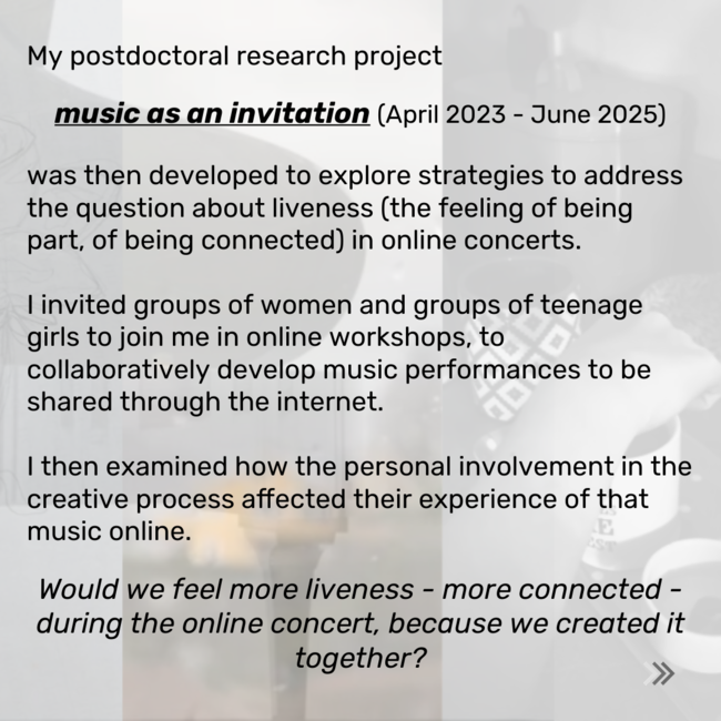 [3] DECOTÉ RODRIGUES, Késia. 2025. music as an invitation year 1 – processes of co-creation of an online piano concert. https://www.researchcatalogue.net/view/2975619/2975620