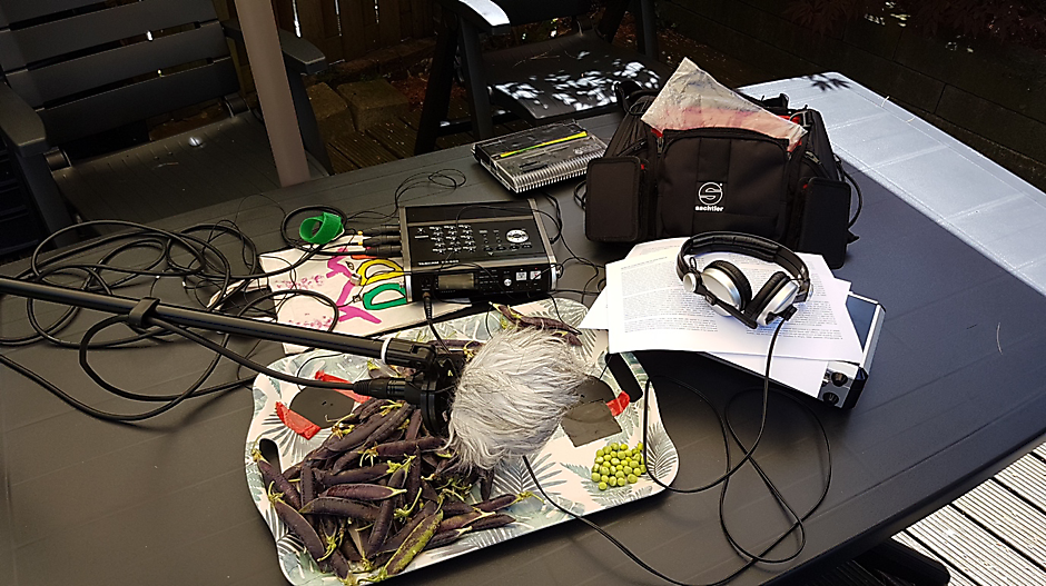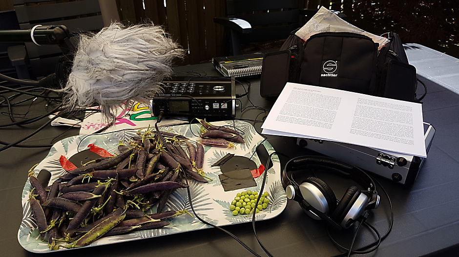 I am busy preparing food, tangentially related in my thoughts to Tara Brabazon’s article. But this reading is highly staged, an arbitrary but somehow inevitable combination of recitation and pea shelling, piles of organic material and wiring. I wonder how many ways there are to escape the inevitable recordist-determined framing and staging of the recording act.