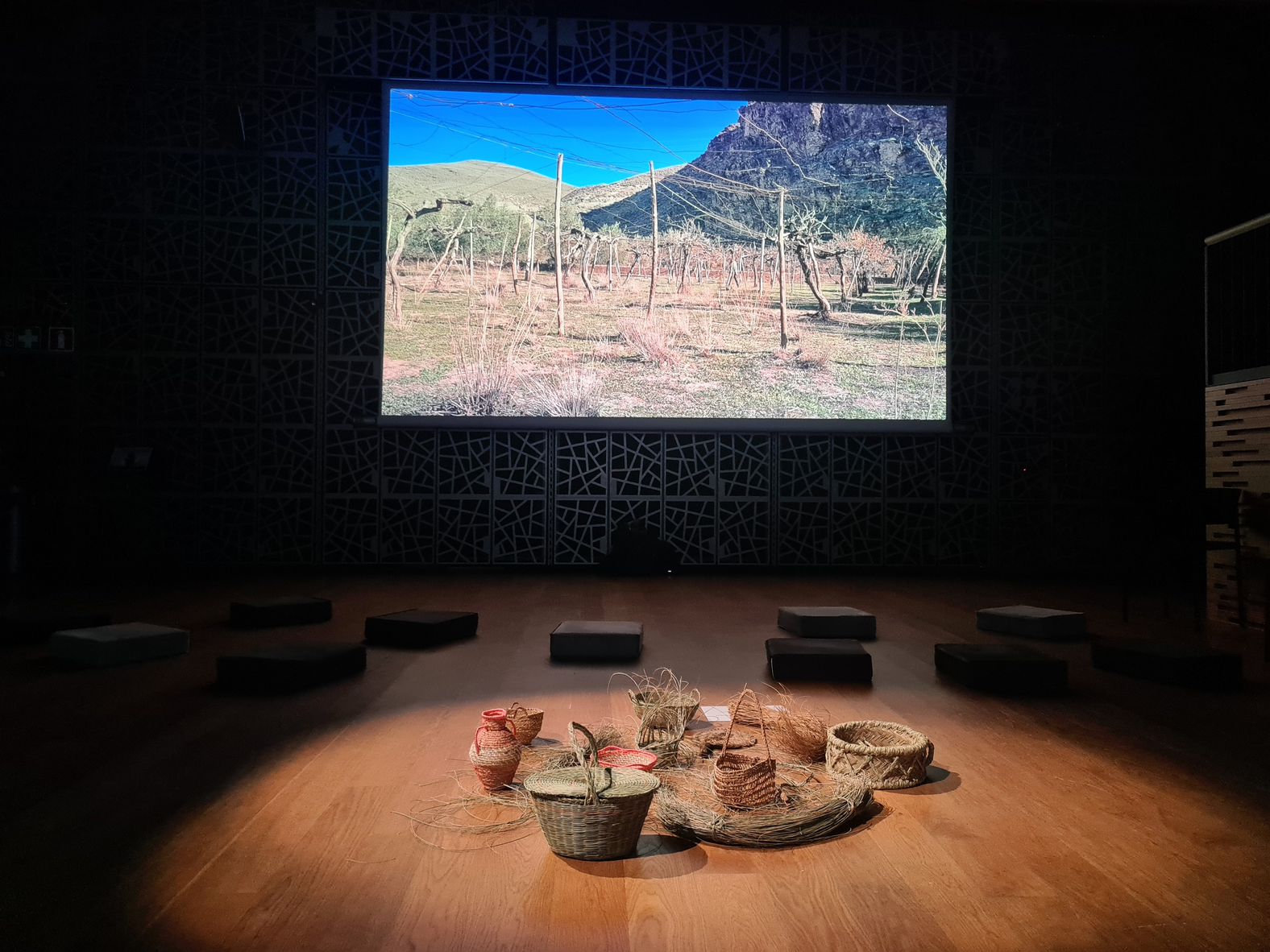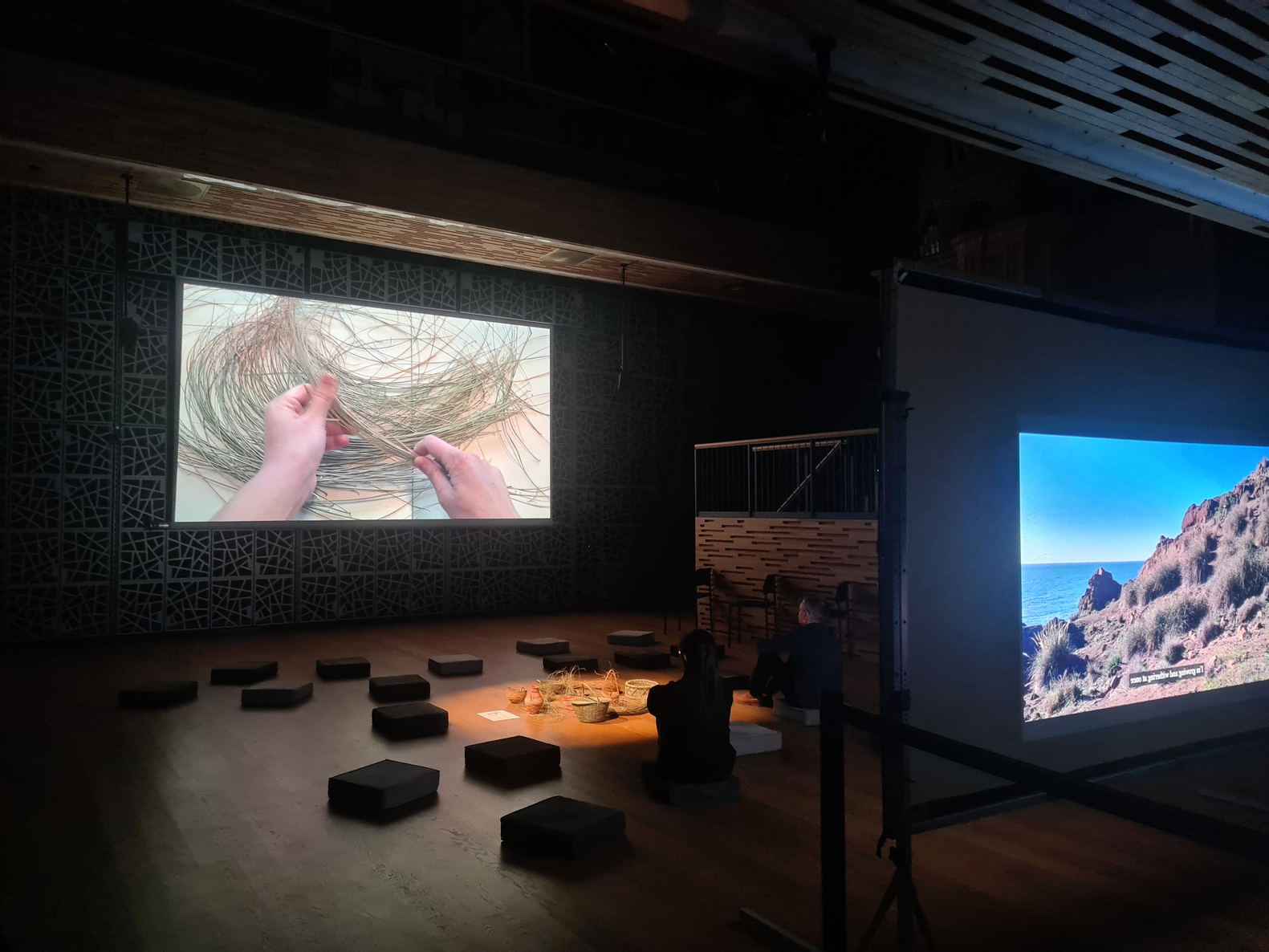 Alongside the two video projections, a space in the center of the hall was dedicated to a series of objects made of esparto and bundles of esparto grass that the audience was invited to touch and spend time with (either while watching the videos or as a separate experience). This space was meant to allow the audience to create a memory of their own from esparto grass. I wondered whether it could remind them of something they knew, as handcrafting with vegetal fibers is something common in many different cultural contexts[5]. The touch (and even the smell) of the grass also offered an additional sensorial layer to the installation with a strong connection to what was shown in the videos. Indeed, some of the videos showing esparto objects being manipulated were especially successful in encouraging the audience to mimic such gestures with the objects present in the hall, perhaps in order to relate to the displayed situation while having a direct experience of the material. All the esparto objects shown in the videos were available in the hall (alongside other objects and grass I had collected during the field trips), and so this added a certain intimacy to the experience, backed by the story behind the objects that was told in the videos.