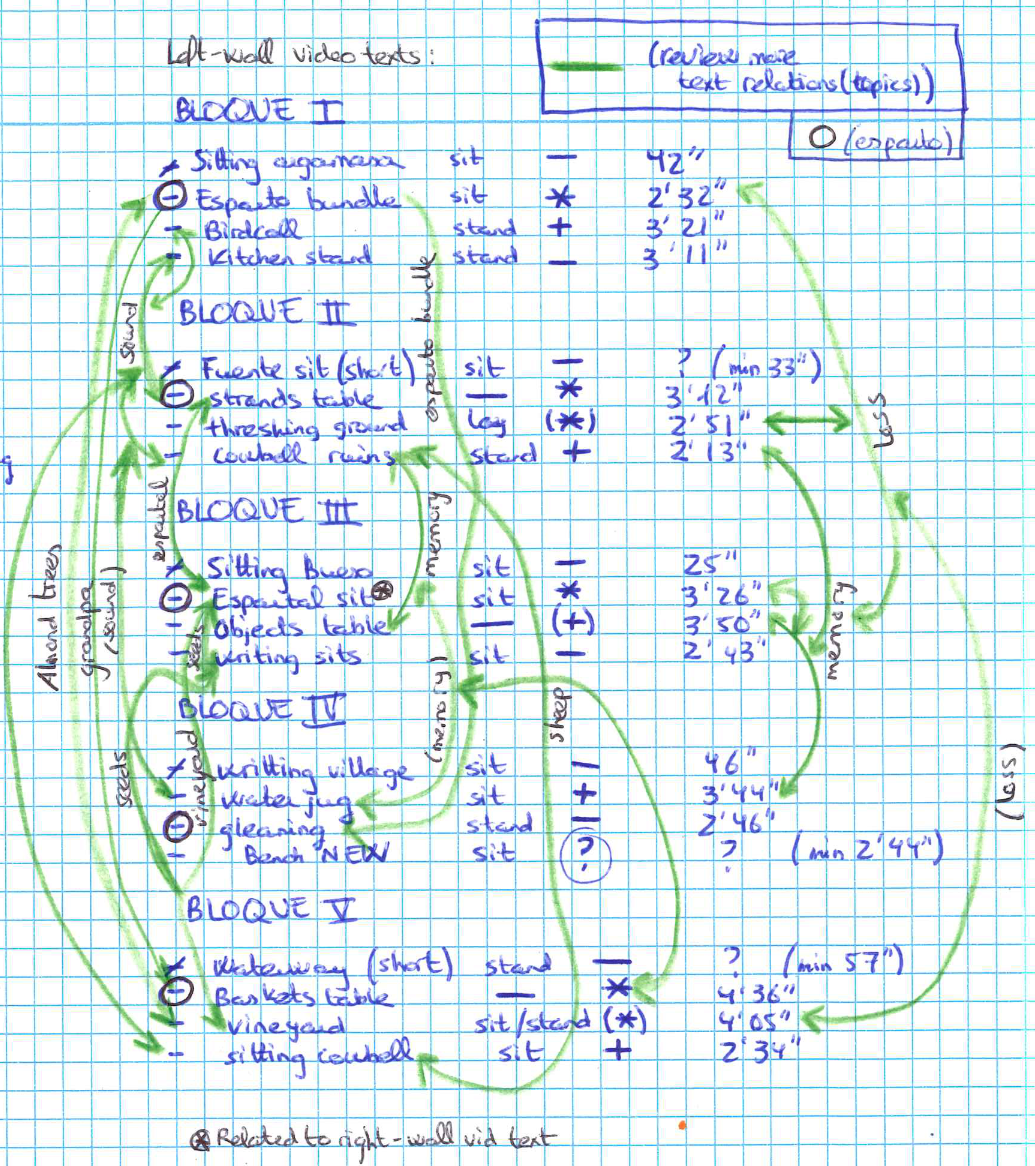 - The video on the left wall (52’) bears a more reflective character, resembling the work at the studio while revisiting the different moments of the practice on site. It consists of a succession of 20 short videos (ranging between 30’’ and 5’ each). There is no apparent narrative connection between the short videos, but the complete thing does acquire meaning as a whole due to the before-mentioned common elements that can be traced among the displayed images, sounds, and words. When I started to work on this video, I thought the order of the short videos did not matter, and so I would not think about it, at least from a narrative point of view. Eventually, certain aspects of the short videos, identified as well in the inventory table, eased the decision-making process in this respect. Some of those aspects were the recurrence of esparto grass throughout the complete video, the balance between videos with heavier or lighter text or sound content, etc. This kind of compensating work also contributed to the fact that the complete video can be watched and understood from any point of the loop onward.