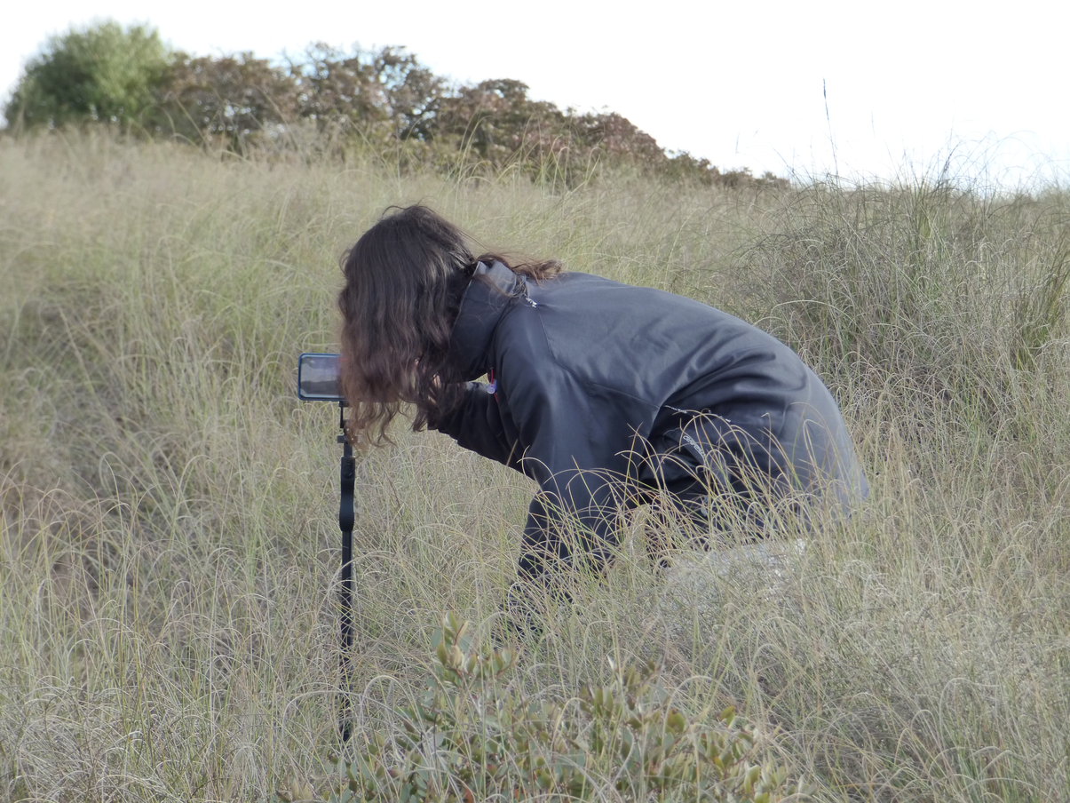 - The video on the right wall (20’) bears a more contemplative character, conveying the work on site from a “real-time” perspective. It consists of a single video that summarizes the exploration I carried out and documented in an espartal (the place where esparto bushes grow). The sound of this video, which consists of waves from the sea, the wind, and some sparse birds, created a continuum in the space that contrasted with the sound environment changes occurring in the opposite video, at some moments being masked by it and at some others filling up its sonic gaps. The text included in this video, in contrast with the somewhat narrative character of the texts in each of the left-wall short videos, consists of an array of short sentences that linger over the image for a longer time and can be read from any point onward. This sort of non-narrative contemplation was built around the iterated phrase “I’m an esparto bush”. Some time after the video was created, I realized this text created a certain “tension” as one is not really sure whether it is the esparto bush or the person appearing in the video who is talking. In my experience, it comes back and forth: sometimes it's the plant, sometimes it’s me speaking out through that text, as in the video sometimes I’m there, but sometimes I disappear and it’s just the bushes, the sea, the sun, the breeze.