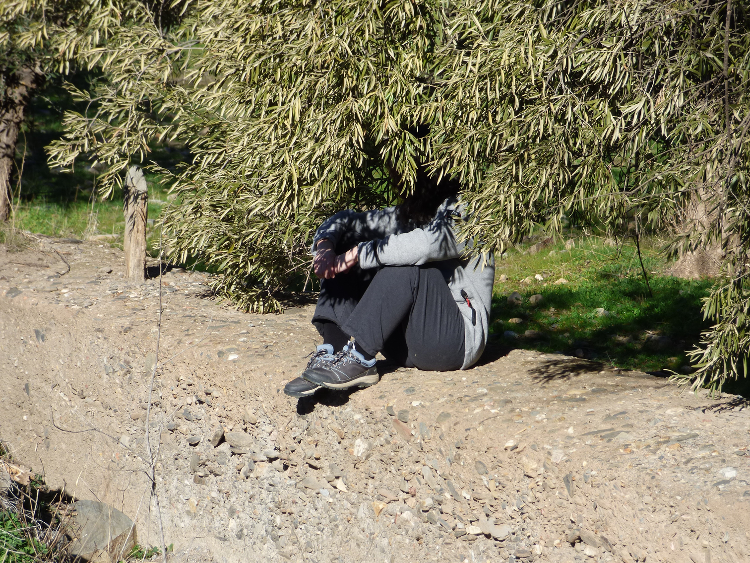 Sitting with an olive tree. Olive trees are one of the few trees in the farmhouse that didn't dry up (Abla, Spain). Photo by Juan A. Miralles. December 2024