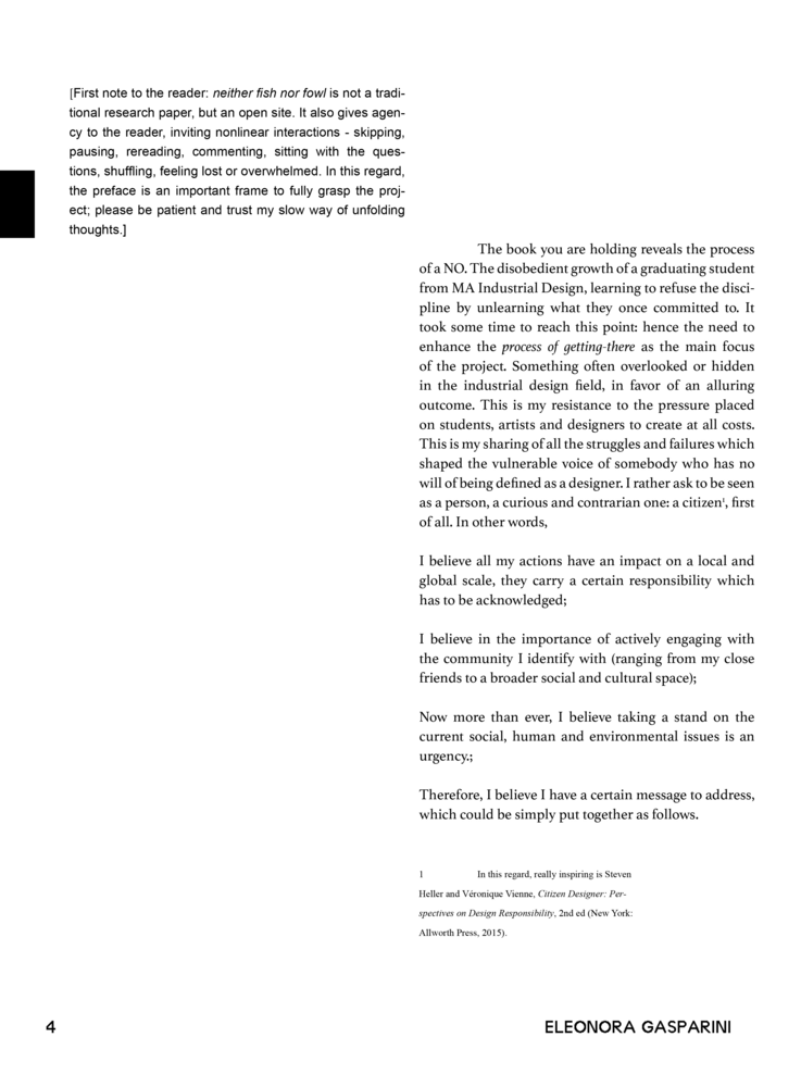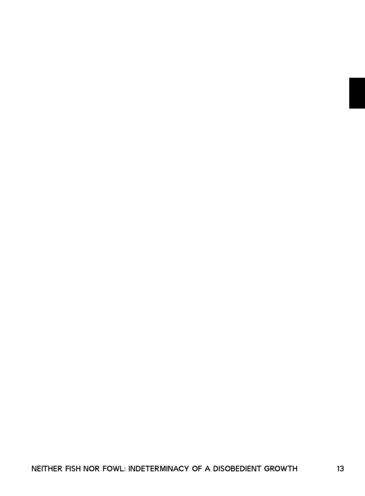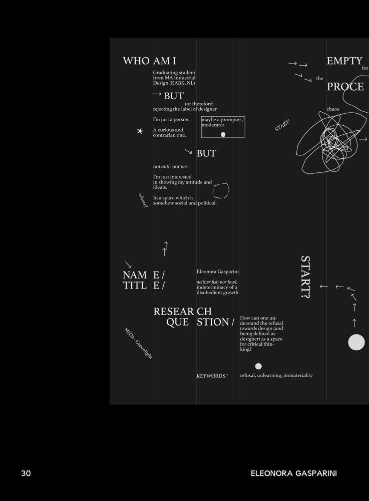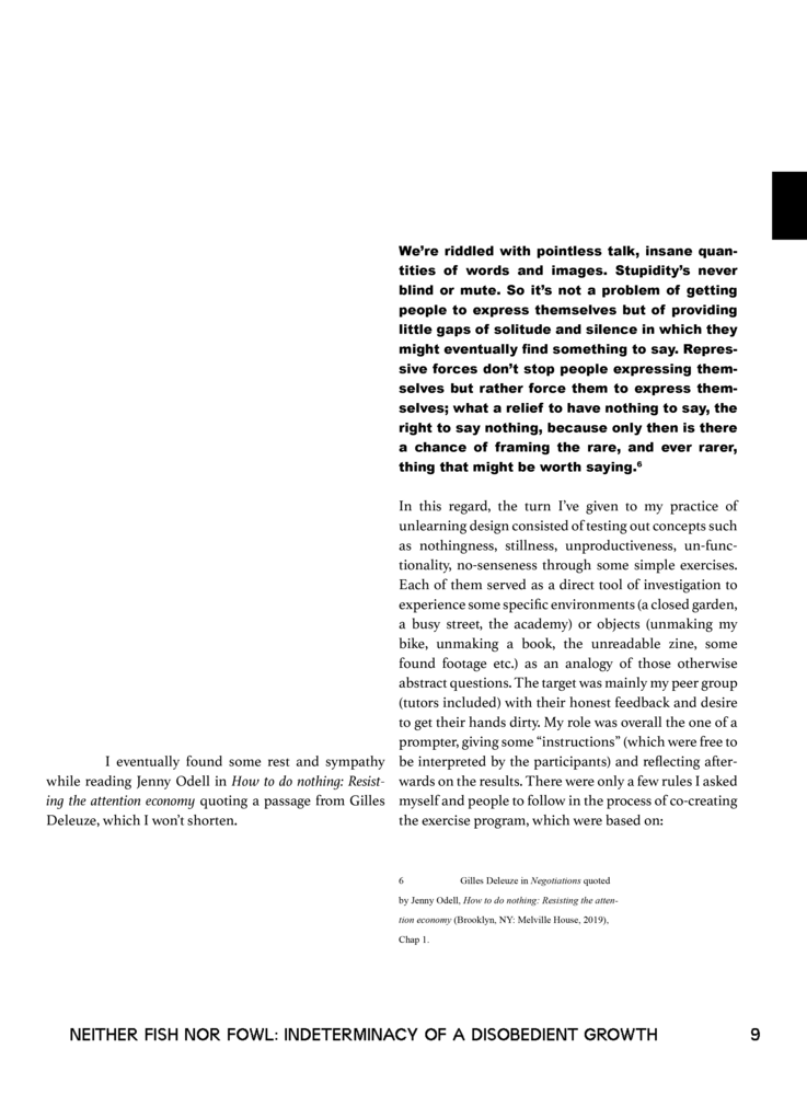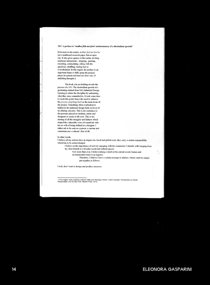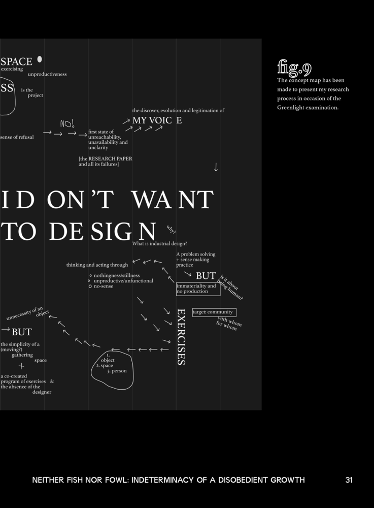 neither fish nor fowl is an act of refusal, witnessing the growth of a NO toward Western industrial design from the point of view of a graduating student. By claiming, “I don’t want to design and produce anymore”, the discipline - known for being a problem-solving and sense-making practice - is called into question. This decision stems from the urgency to pause the relentless capitalist cycle of production and consumption of which design is a part. Consequently, a paradox arises to provoke thought: can we stand still in the midst of constant hyperactivity? The research highlights the process of this growth as the main focus of the project - the negative space normally overlooked in favor of an alluring outcome. It branches out through theoretical studies and an exercise-based practice of unlearning. Concepts such as nothingness, stillness, unproductiveness, un-functionality and no-senseness are explored in a space of co-creation and ongoingness.