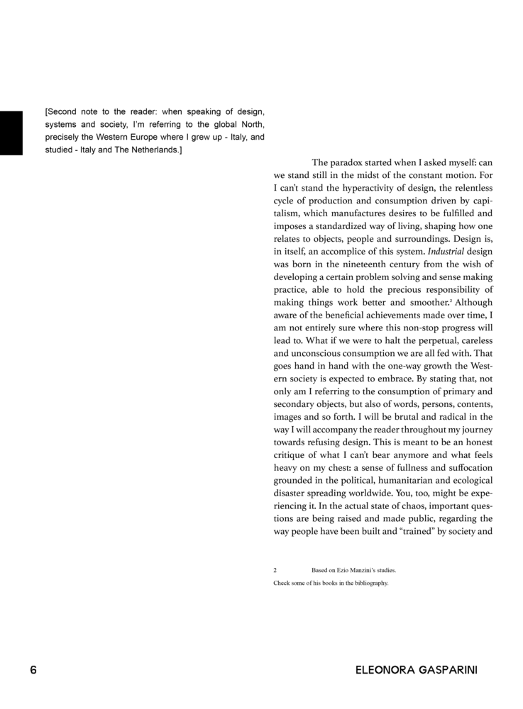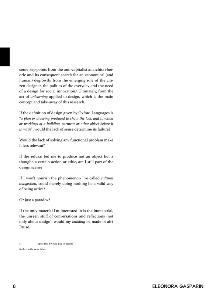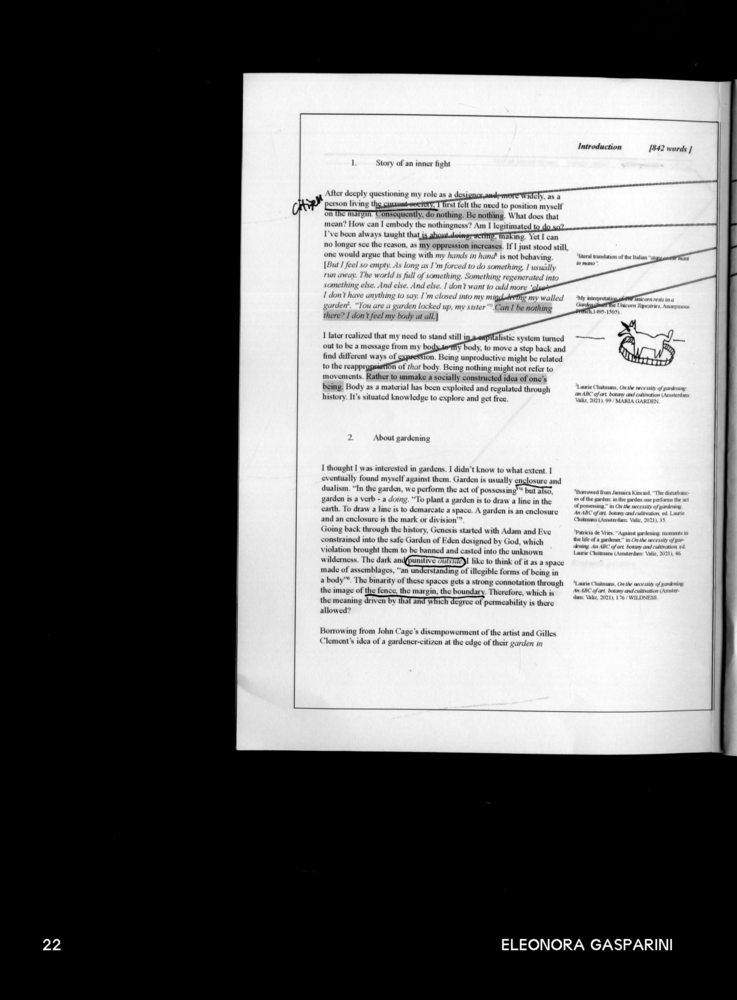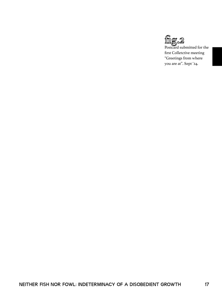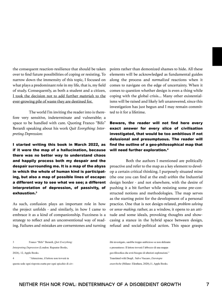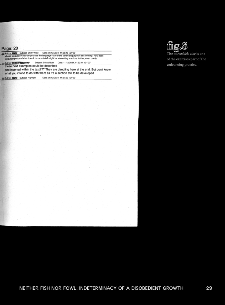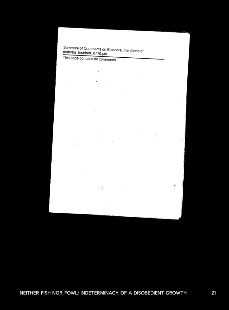 neither fish nor fowl is an act of refusal, witnessing the growth of a NO toward Western industrial design from the point of view of a graduating student. By claiming, “I don’t want to design and produce anymore”, the discipline - known for being a problem-solving and sense-making practice - is called into question. This decision stems from the urgency to pause the relentless capitalist cycle of production and consumption of which design is a part. Consequently, a paradox arises to provoke thought: can we stand still in the midst of constant hyperactivity? The research highlights the process of this growth as the main focus of the project - the negative space normally overlooked in favor of an alluring outcome. It branches out through theoretical studies and an exercise-based practice of unlearning. Concepts such as nothingness, stillness, unproductiveness, un-functionality and no-senseness are explored in a space of co-creation and ongoingness.