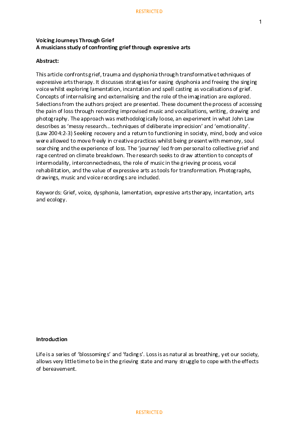 | This article confronts grief, trauma and dysphonia through transformative techniques of expressive arts therapy. It discusses strategies for easing dysphonia and freeing the singing voice whilst exploring lamentation, incantation and spell casting as vocalisations of grief. Concepts of internalising and externalising and the role of the imagination are explored. Selections from the authors project are presented. These document the process of accessing the pain of loss through recording improvised music and vocalisations, writing, drawing and photography. The approach was methodologically loose, an experiment in what John Law describes as ‘messy research… techniques of deliberate imprecision’ and ‘emotionality’. (Law 2004:2-3) Seeking recovery and a return to functioning in society, mind, body and voice were allowed to move freely in creative practices whilst being present with memory, soul searching and the experience of loss. The ‘journey’ led from personal to collective grief and rage centred on climate breakdown. The research seeks to draw attention to concepts of intermodality, interconnectedness, the role of music in the grieving process, vocal rehabilitation, and the value of expressive arts as tools for transformation. Photographs, drawings, music and voice recordings are included. |