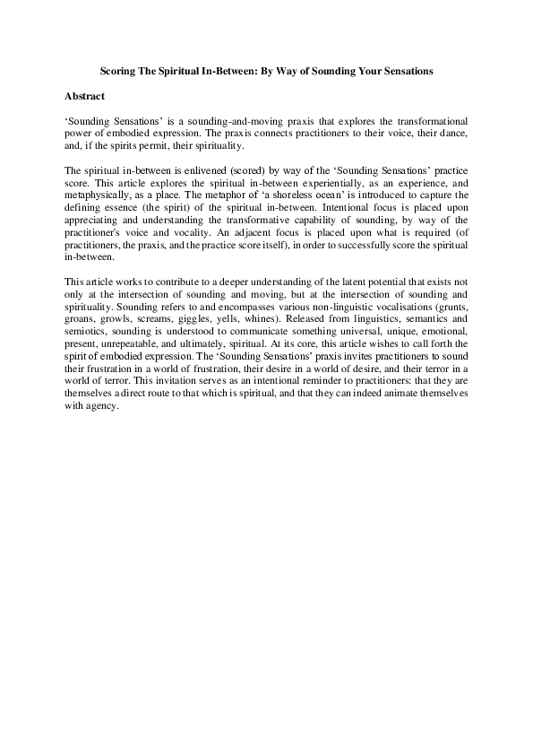 | ‘Sounding Sensations’ is a sounding-and-moving praxis that explores the transformational power of embodied expression. The praxis connects practitioners to their voice, their dance, and, if the spirits permit, their spirituality. The spiritual in-between is enlivened (scored) by way of the ‘Sounding Sensations’ practice score. This article explores the spiritual in-between experientially, as an experience, and metaphysically, as a place. The metaphor of ‘a shoreless ocean’ is introduced to capture the defining essence (the spirit) of the spiritual in-between. Intentional focus is placed upon appreciating and understanding the transformative capability of sounding, by way of the practitioner's voice and vocality. An adjacent focus is placed upon what is required (of practitioners, the praxis, and the practice score itself), in order to successfully score the spiritual in-between. This article works to contribute to a deeper understanding of the latent potential that exists not only at the intersection of sounding and moving, but at the intersection of sounding and spirituality. Sounding refers to and encompasses various non-linguistic vocalisations (grunts, groans, growls, screams, giggles, yells, whines). Released from linguistics, semantics and semiotics, sounding is understood to communicate something universal, unique, emotional, present, unrepeatable, and ultimately, spiritual. At its core, this article wishes to call forth the spirit of embodied expression. The ‘Sounding Sensations’ praxis invites practitioners to sound their frustration in a world of frustration, their desire in a world of desire, and their terror in a world of terror. This invitation serves as an intentional reminder to practitioners: that they are themselves a direct route to that which is spiritual, and that they can indeed animate themselves with agency. |