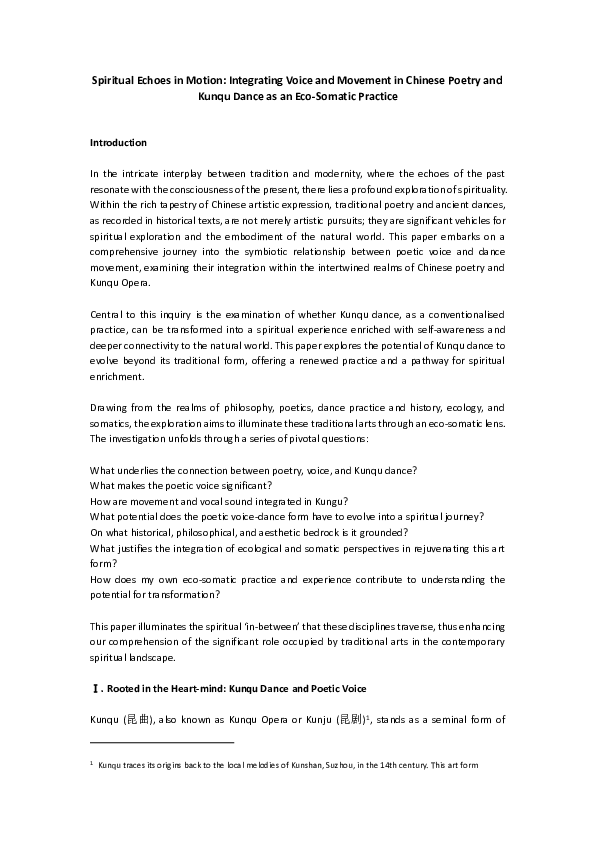 | This chapter delves into the complex interplay between tradition and modernity, exploring the profound spiritual undercurrents within Chinese artistic expression, specifically through the lens of traditional poetry and Kunqu dance. At the core of this investigation is the potential of Kunqu’s embodied practice, which weaves together poetic voice and dance movement, to transcend mere aesthetic pursuits and become a conduit for spiritual experience, fostering self-awareness and a deeper connection with nature. Employing an interdisciplinary framework that combines theoretical insights with practical experience, this research examines the symbiotic relationship between voice and movement within Kunqu Opera. Through critical analysis and eco-somatic practice, it addresses pivotal questions concerning the connection between poetry and Kunqu dance, the significance of poetic voice, and the potential for a renewed practice that integrates poetic voice and Kunqu dance to facilitate a spiritual journey rooted in historical, philosophical, and aesthetic foundations. The findings suggest that reimagining Kunqu through an eco-somatic lens not only rejuvenates these traditional arts but also underscores their relevance in addressing contemporary spiritual and ecological challenges across cultural boundaries. This study aims to expand the understanding of cultural practices as vehicles for spiritual exploration, advocating for a more nuanced appreciation of traditional arts within the modern spiritual landscape. |