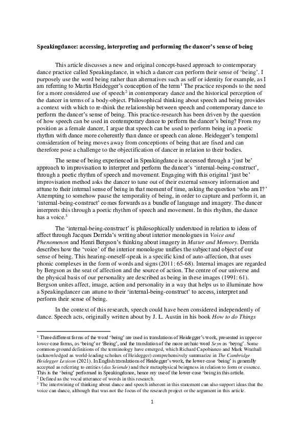 This article discusses a new concept-based approach to contemporary dance practice called Speakingdance, in which a dancer performs their sense of being. The practice responds to the need for a more considered use of speech in contemporary dance and the historical perception of the dancer in terms of a body-object. Philosophical thinking about speech and being provide a framework with which to re-think the relationship between speech and contemporary dance to perform a dancer’s sense of being. The practice research approach, that Speakingdance has emerged from, values the agency and experience of the practitioner-scholar as part of a phenomenological enquiry. Practical experiments with the performance of dance and speech were documented through video and written experiential accounts. Following a period of studio-based exploration, to formulate the ‘just be’ approach to improvisation and the poetic rhythm of speech and dance in which dance ‘speaks’, three new solo ‘practice sharings’ were created to gather information about the resonant impact of the practice on audience members. The presence of resonance indicates that a relational engagement with the dancer’s being has been encountered and that the perception of the dancer has shifted away from body-object terms. The practice of Speakingdance provides a meaningful purpose for the use of speech in contemporary dance – to perform the dancer’s sense of being and promote a resonant relationship between the dancer and individual audience members. Further to this, the practice has revealed a particular conceptualization of being through what has been termed the ‘internal-being-construct’. The article encapsulates some of the findings of academic research on the topic of dance and speech which is only just emerging, and contributes a unique discussion of the of the dancer’s ontology.