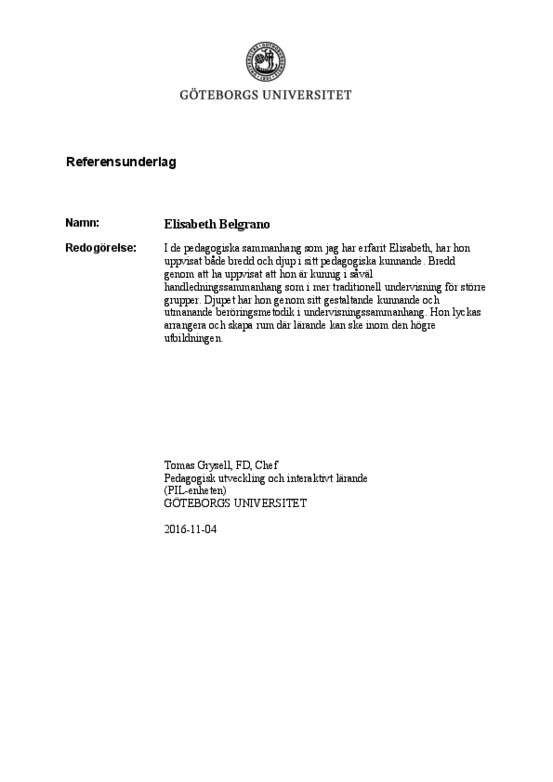 Letter of Recommendation, Prof. Tomas Grysell, Head of Pedagogical Development and Interactive Learning, University of Gothenburg