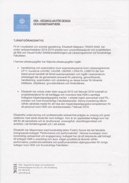 Between 1 August 2015 - 7 Feb 2016 I was employed at HDK (50%) as a Project Co-ordinator (Projektsamordnare, validering), for supervising, co-ordinating and supporting teachers at HDK in their processes of validating higher pedagogical experiences.