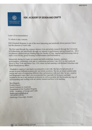 Belgrano, E (2015). Konsten att möta. Från intuition till examen i konst/vetenskap/lig högre utbildning. Högskolepedagogisk konferens, Göteborgs universitet, 22 Oktober