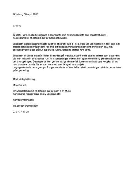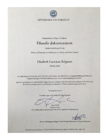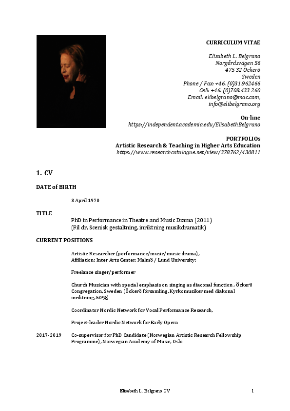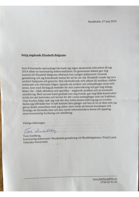 It is with great joy I am applying for this position as lecturer in Performance in Music Drama at the Academy of Music and Drama, Univ. of Gothenburg. The position is demanding the specific skills that I have developed through my artistic practice as a singer and performer, but also as an artistic researcher aiming to find ways and strategies for assembling practice-as-research (or artistic research) with teaching and learning in higher arts education. I completed my doctoral education in the specific area requested for this position (scenisk gestaltning med inriktning musikdramatik) and my doctoral thesis was the first one ever to be presented and accepted with great success in the field on a national level.