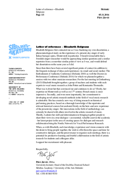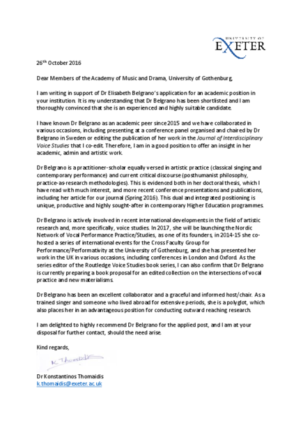 Reference letters from dr. Konstantinos Thomaidis (University of Exeter / UK) and dr. Päivi Järviö (Sibelius Academy / Finland):