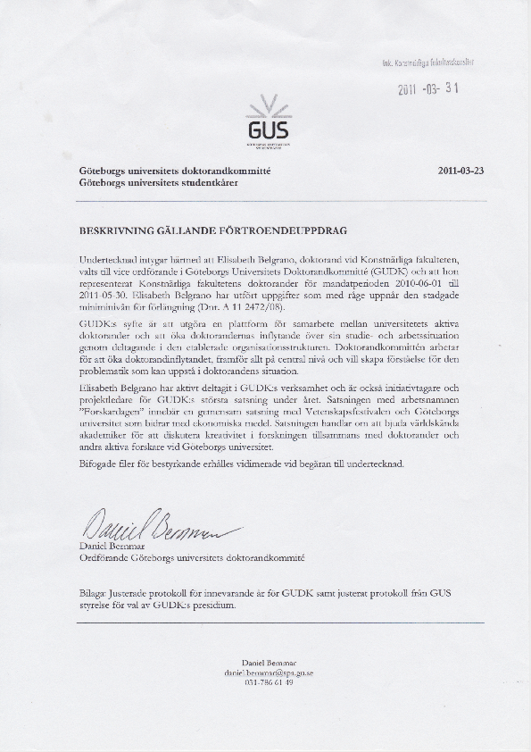 • Doktorandrepresentant, Forskarutbildningsrådet (FUR), Konstnärliga fakulteten, Göteborgs Universitet.