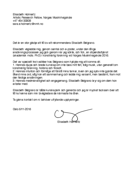 Currently supervising a doctoral fellow at Norwegian Academy of Music, Oslo. Have been acting as shadow supervisor for potential Master & PhD students. See the following letters of recommentation by Tove Dahlberg (currently PhD Fellow in vocal Performance / Music Drama), Elisabeth Holmertz (currently PhD fellow in Vocal Performance/Music Drama, Anna Thunström (Currently Master Student in Contemporary Performance), Ida Görsch (Master in Music Drama)