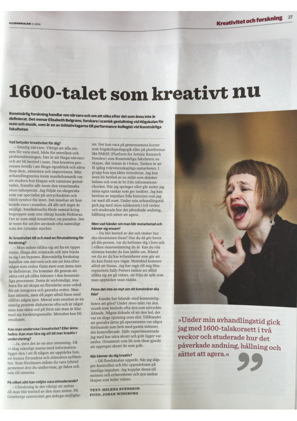 - Nine intra-active lectures on VOICE & PERFORANCE, Aktivt medverkande i seminarierna: Röst pedagoger, sångare, musiker, konstnärer från Göteborgs universitet.