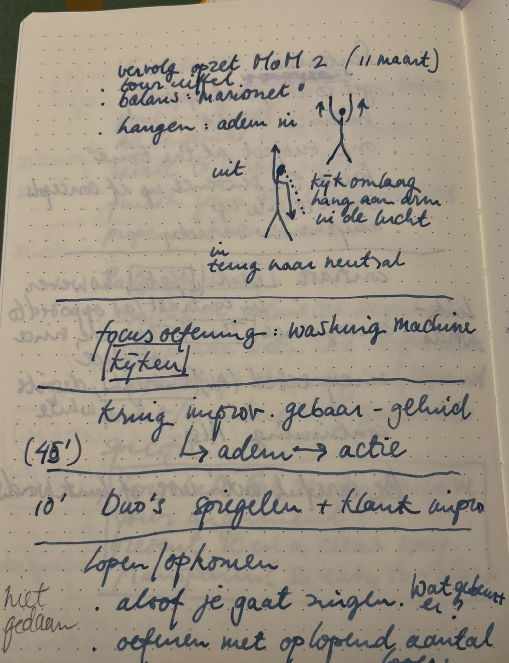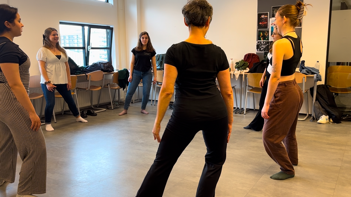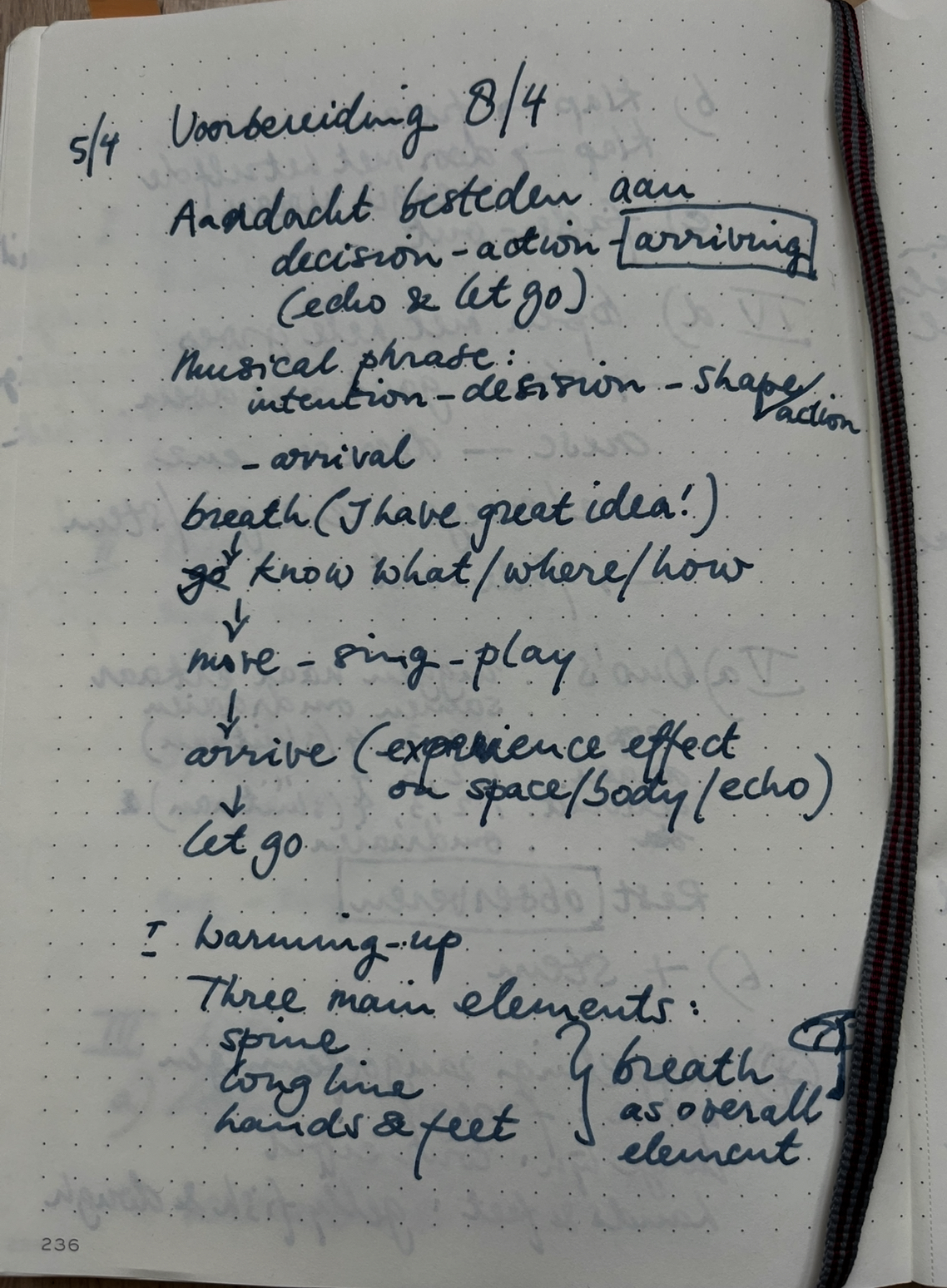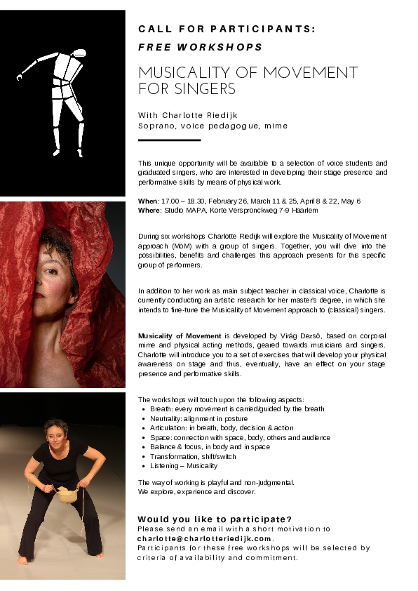 The third intervention of this exposition consists of my observations of and participation in physical acting classes at Codarts, University of the Arts, Rotterdam, spread over the 2023-2024 academic year. These weekly, one-and-a-half-hour-longclasses are tailored to voice students and taught by Virág Dezsö, who is the source of the Musicality of Movement approach. The lessons are for Bachelor I and II students and were also attended by Master I students. During the school year I took part in these classes four times, including the final presentation and assessment sessions—which I only observed.
