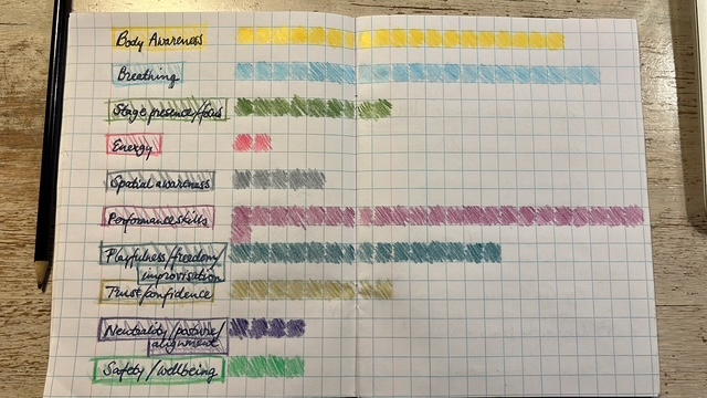 The seven categories mentioned by MHI students (body awareness, breathing, energy, stage presence, performance skills, playfulness,trust) will further on in this chapter be extended with three more that remained unmentioned by the Swedish students and were mentioned several times by students in Codarts and Haarlem (spatial awareness, neutrality,safety/wellbeing). The coloring of the keywords corresponds with the colors I will use later, when collecting all comments in one overview table. The audio transcription of this conversation can be found in the appendix.