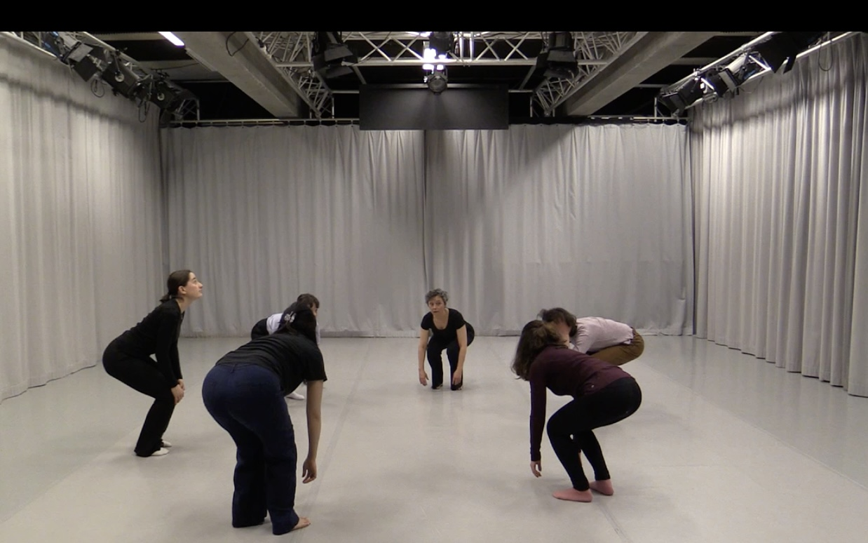 It can start with an apparently easy exercise which is revealing and confrontational when done for the first time: walking individually while being observed by the others in the room. It gives a lot of information about different bodies in motion, posture, breath. This leads to the next step, the realization that any action needs preparation, action, arrival, and ending. With this the participants will do another round of individual walking. After that walking synchronically two-by-two will be introduced, one performer leading, the other following (they change roles later). Their task is to synchronize their walk, starting and ending together, without orally guiding. The leader must take care of her co-walker so she cannot just start and stop, there is no talking but only sensing. After that, the walking still must be together yet without leader, requiring the performers find a shared intention from within. Next step will be walking with three and more performers, still finding the synchronization without a leader.