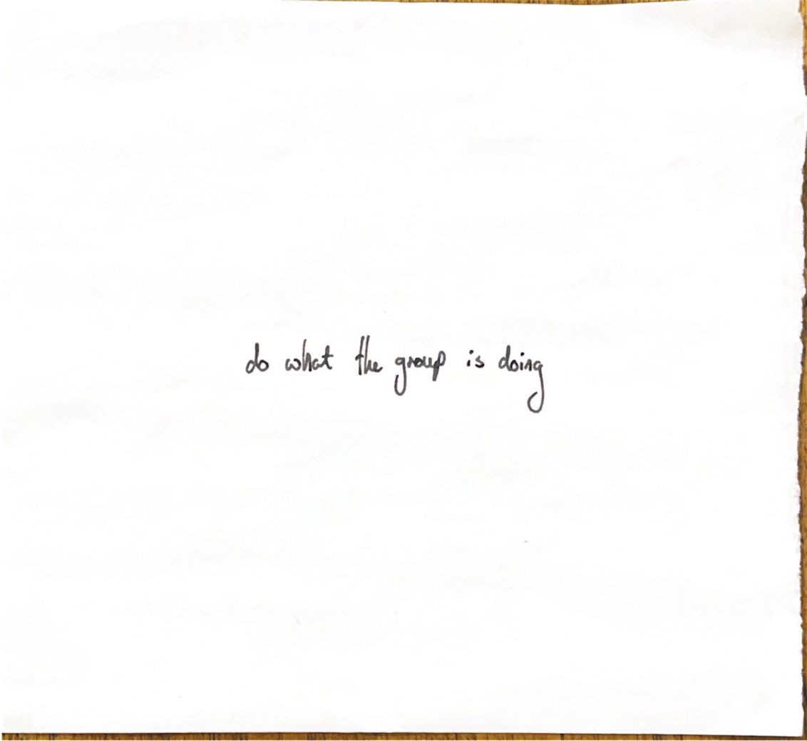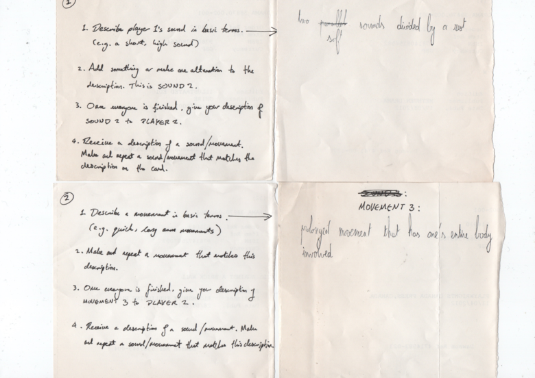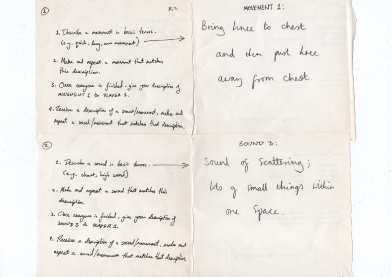 in this activity, performers alternate between describing a movement/sound and doing it, and describing someone else’s movement/sound and making slight alterations to it.