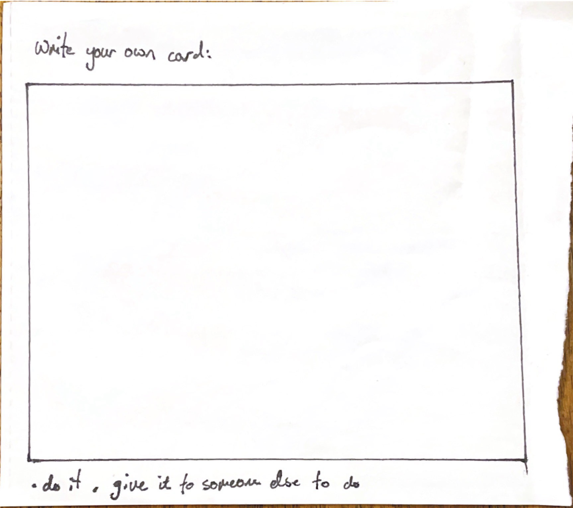 following our discussion after the previous session, i began experimenting with the individual, physical cards as spaces for open instructions, or as spaces for writing.