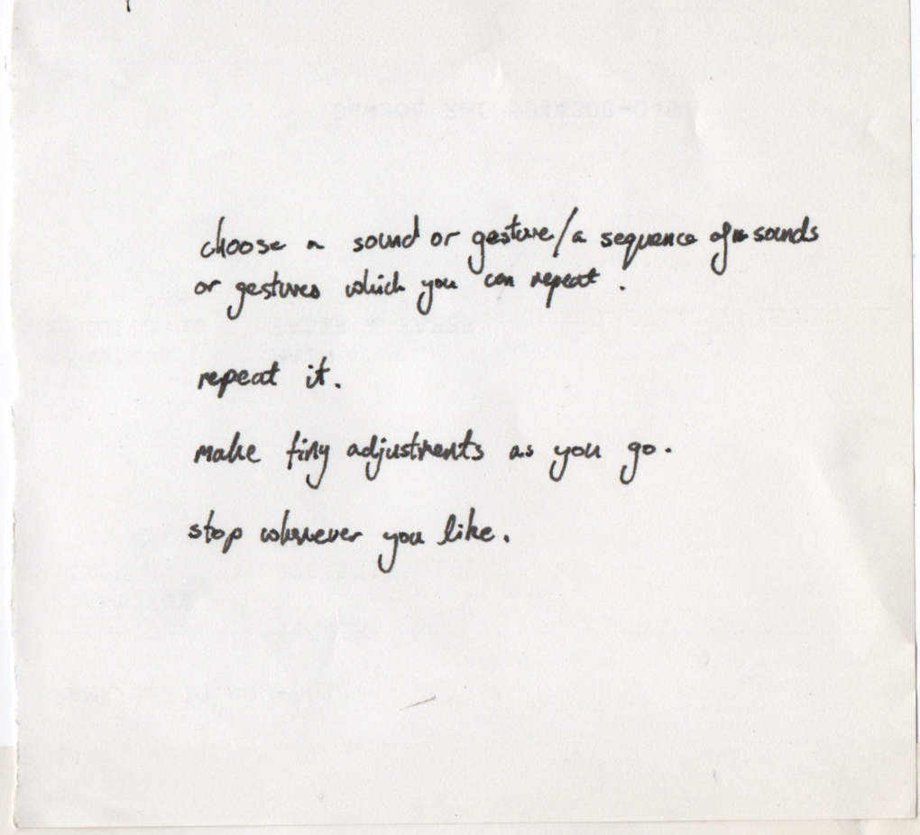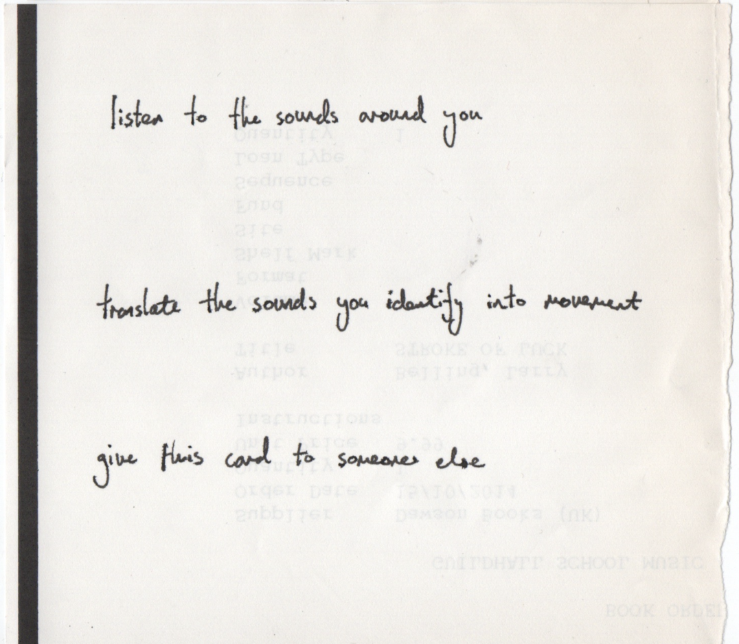 taking inspiration from the 'cards for 3' exercise from the previous session, i included cards that allow multiple performances of one person's description of a movement or sound.
