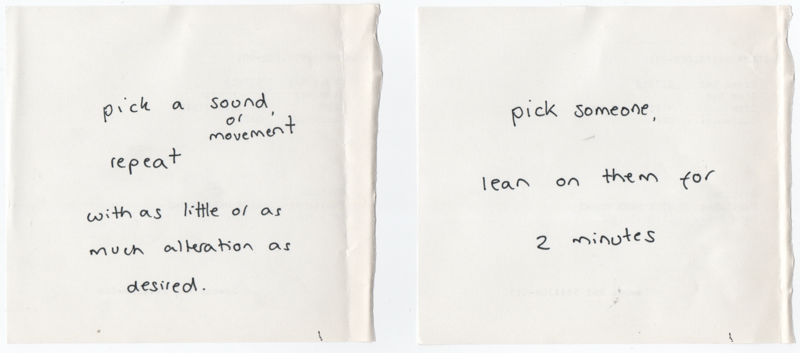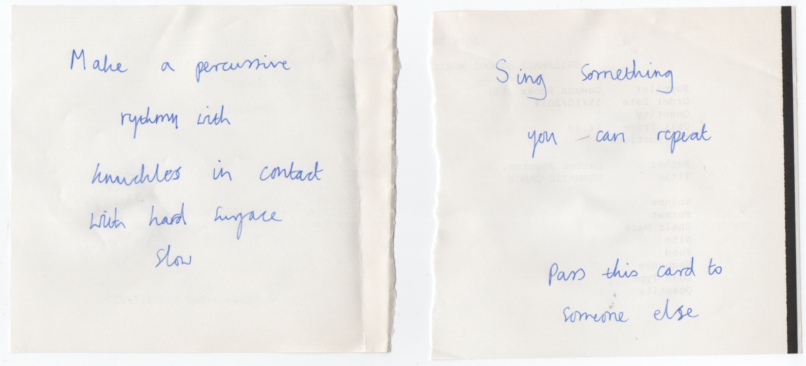 it is clear that cards, open instructions, and score-making were becoming predominant themes in our practice. the following 3 sessions were focused on exploring something further along these lines.