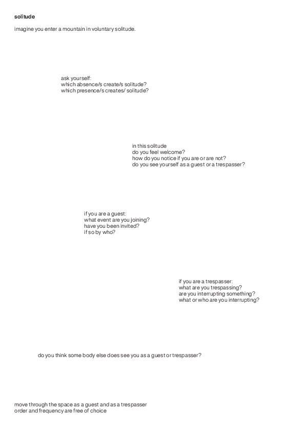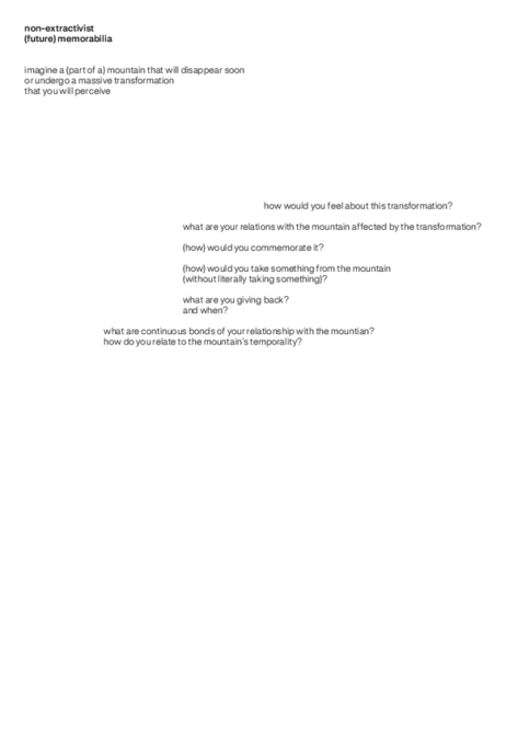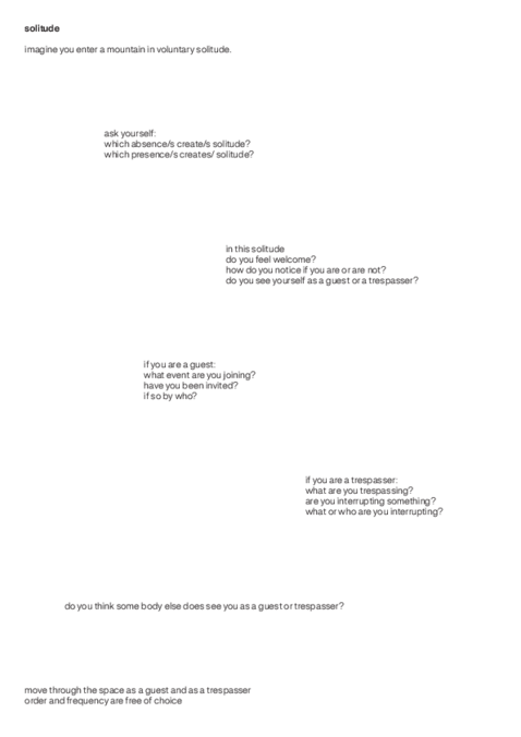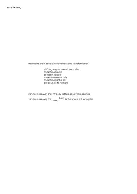 The scores and invitations are a continuing part of my research with which I contribute to "Landscape Translation" (Pitches, 2020) within the field of performance as well as to artistic research methodology, design methodology and mountaineering. Landscape Translation is the conceptual meeting point between two perspectives of training regimes depending on /\/\oun†/\ins, "either conceptually (as places for training to occur), or formally (as inspiring shapes, figures and metaphors) (Ibid). My contribution focuses on acknowledging the temporality and constant transition of a /\/\oun†/\in and an intimate, reciprocal relationship with the /\/\oun†ain. This set is one of many shapes of how to share these kind of experiences, emotions, relations with other audiences.